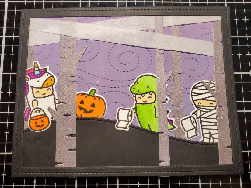 To make the trees, I blended some Lawn Fawn River Rock ink on watercolor paper and cut it with the Birch Trees dies. I like that the paper gives it some texture and makes it look a little rough. I then stamped the characters from the Costume Party set and colored them with Zig markers. They’re just so cute!