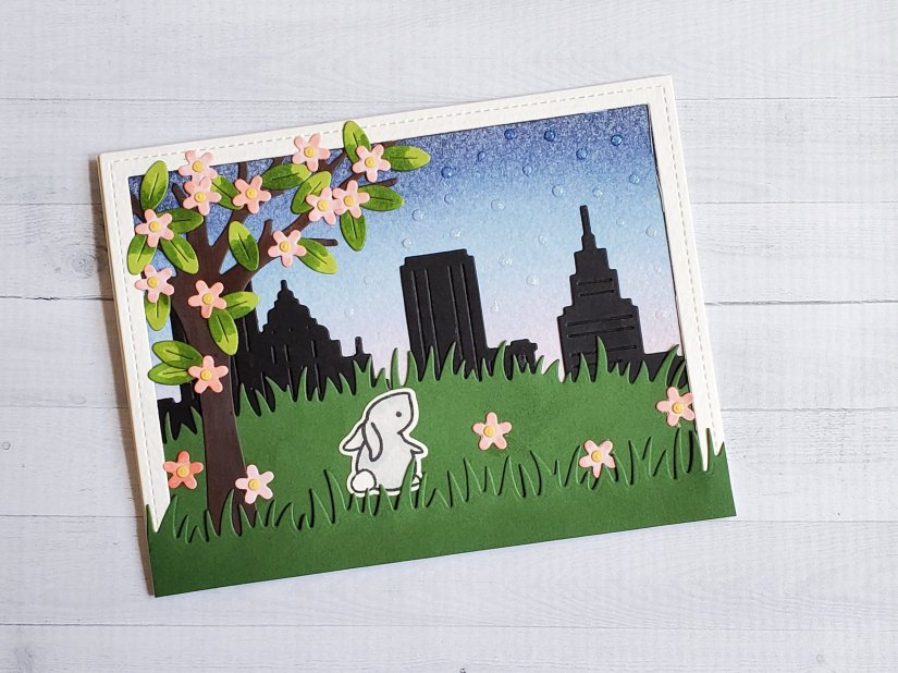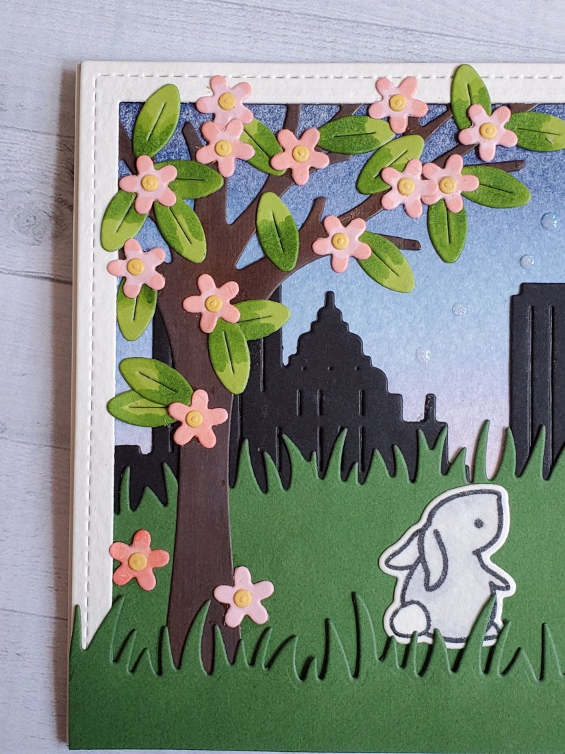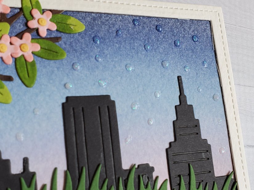 I wish that I had a few more colors of distress inks so that I could have shaded the edges of the grass. I think that would have helped add dimension between the layers. I also think the tree blends in with the background a little too much, and maybe it would’ve been better to not have the city directly behind that part of the card.