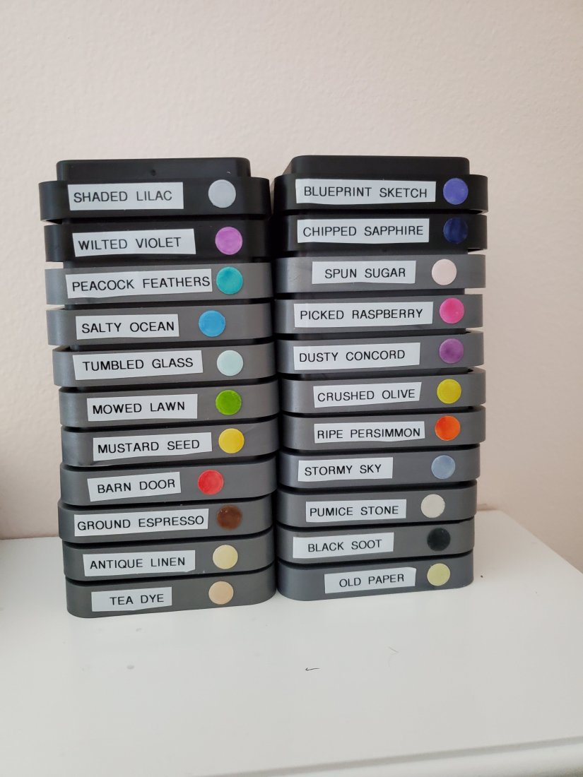 One of my recent changes has been to give my distress inks their own shelf. I had them kind of tucked away in a cubby, but as the collection grew, it became more and more cumbersome to pull them out and find what I needed. This was especially tough because I could only see which ink was which by viewing the top of each one. So if they were stacked, I had to go through the whole stack. It’s frustrating that the manufacturers of these inks don’t make the bases with the name and color printed on them. Or at least that they don’t sell a sticker set or something similar to help people easily label them on their sides.