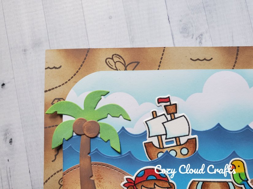 I’m much happier with how improved this card is even from the one I just made last month. The sand and waves have ink blended on the edges to give them more dimension and the treasure map border adds extra interest. I also used a glitter pen on the treasure, but it doesn’t show up well in photos.