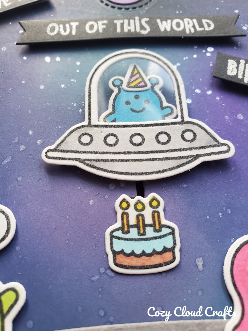 The pull tab from the Let’s Toast add on was a must for this cute alien beaming up the cake! And I added acetate to the spaceship window for an extra touch.