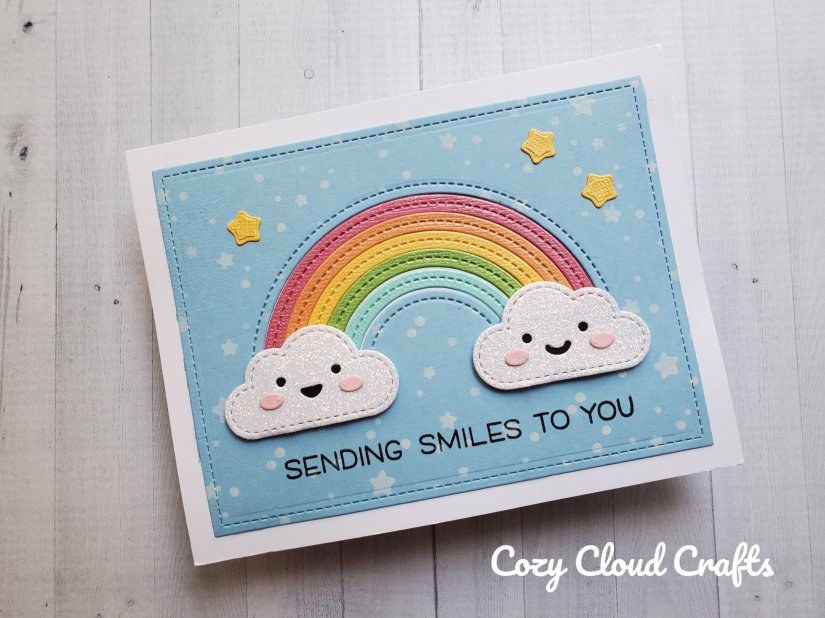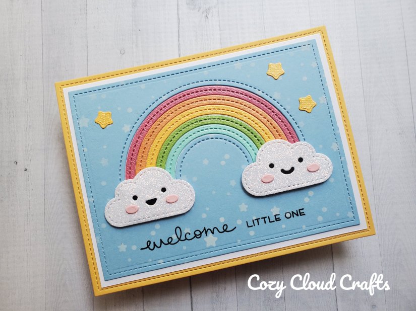 This design was shared by Chari Moss on the Lawn Fawn blog and I immediately loved it. I made her version first, and then decided I would really love to add a yellow border to the design. And once I started cutting the rainbow pieces I figured I might as well make two more cards at once. I think this design is perfect to welcome a new baby, as well as just to send as an anytime card.