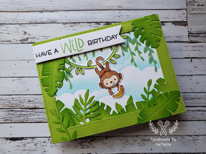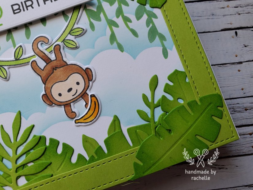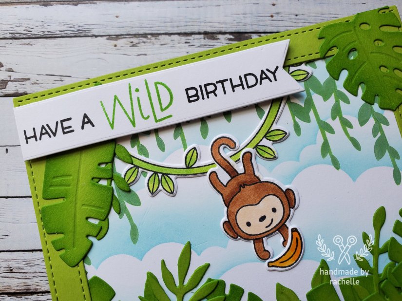 This was my very first time using Hello Bluebird products and I just love that little monkey! I also really love the way the tropical foliage looks cut from Cilantro cardstock and then ink blended with Jalapeno ink. I’m so loyal to Lawn Fawn that I rarely branch out into other companies but these were a hit!