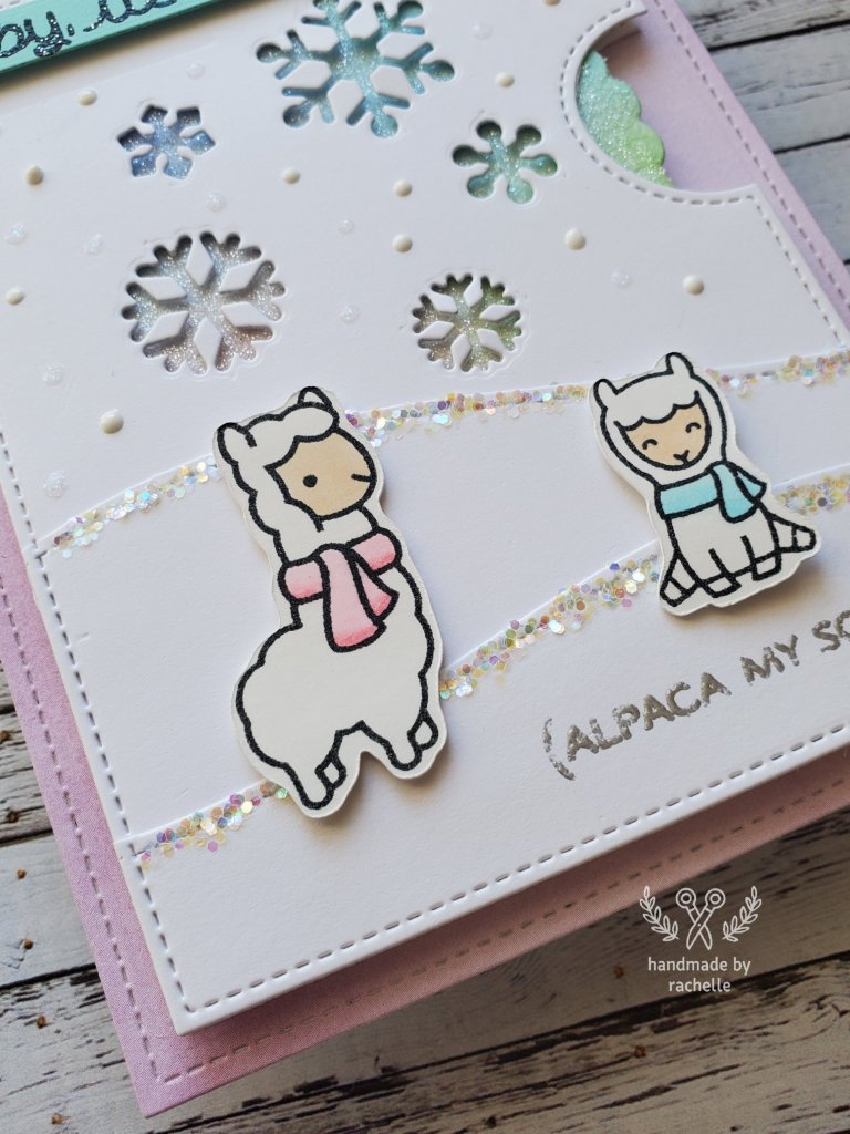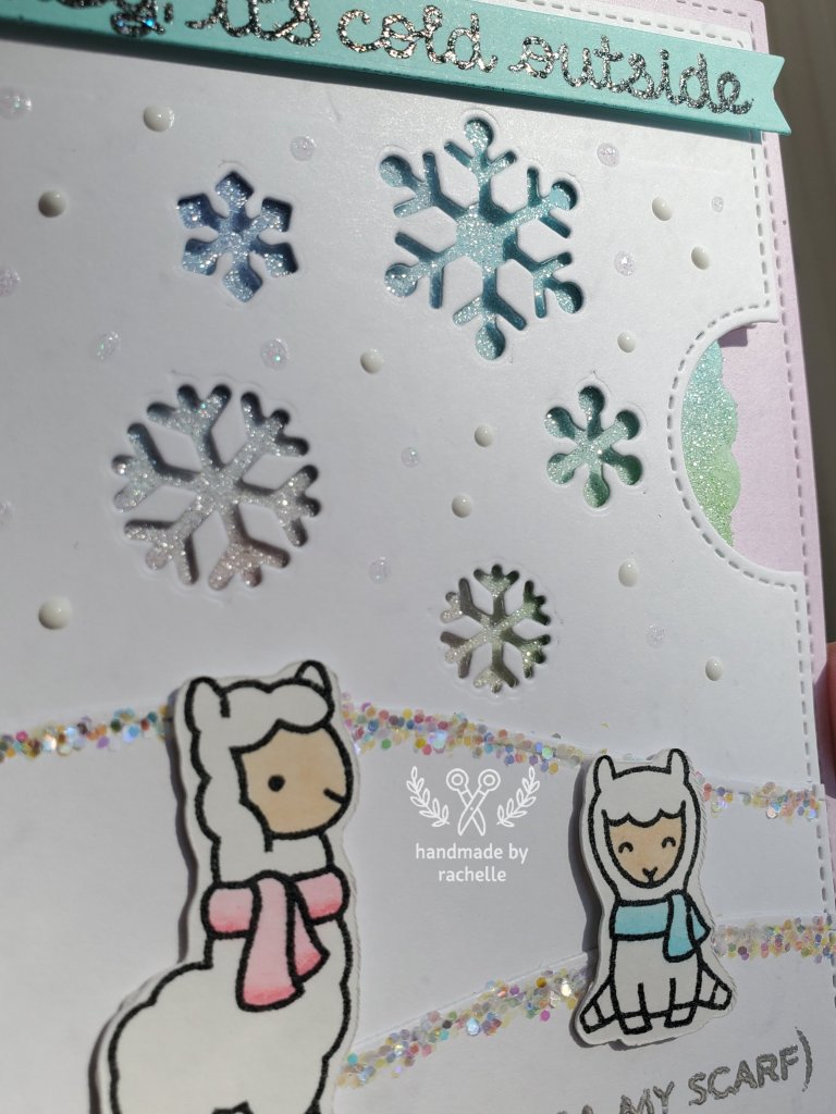 This was my first Christmas/holiday/winter card of the season, and it set the bar high. I love how it turned out! As soon as I finished it, I knew that I was going to want all my holiday cards to have this much (or more) sparkle. This was inspired by Yainea on the Lawn Fawn design team – she always makes SUCH gorgeous cards! I made a few changes of my own and now I just keep staring at all the pretty glitter on this card. 😍