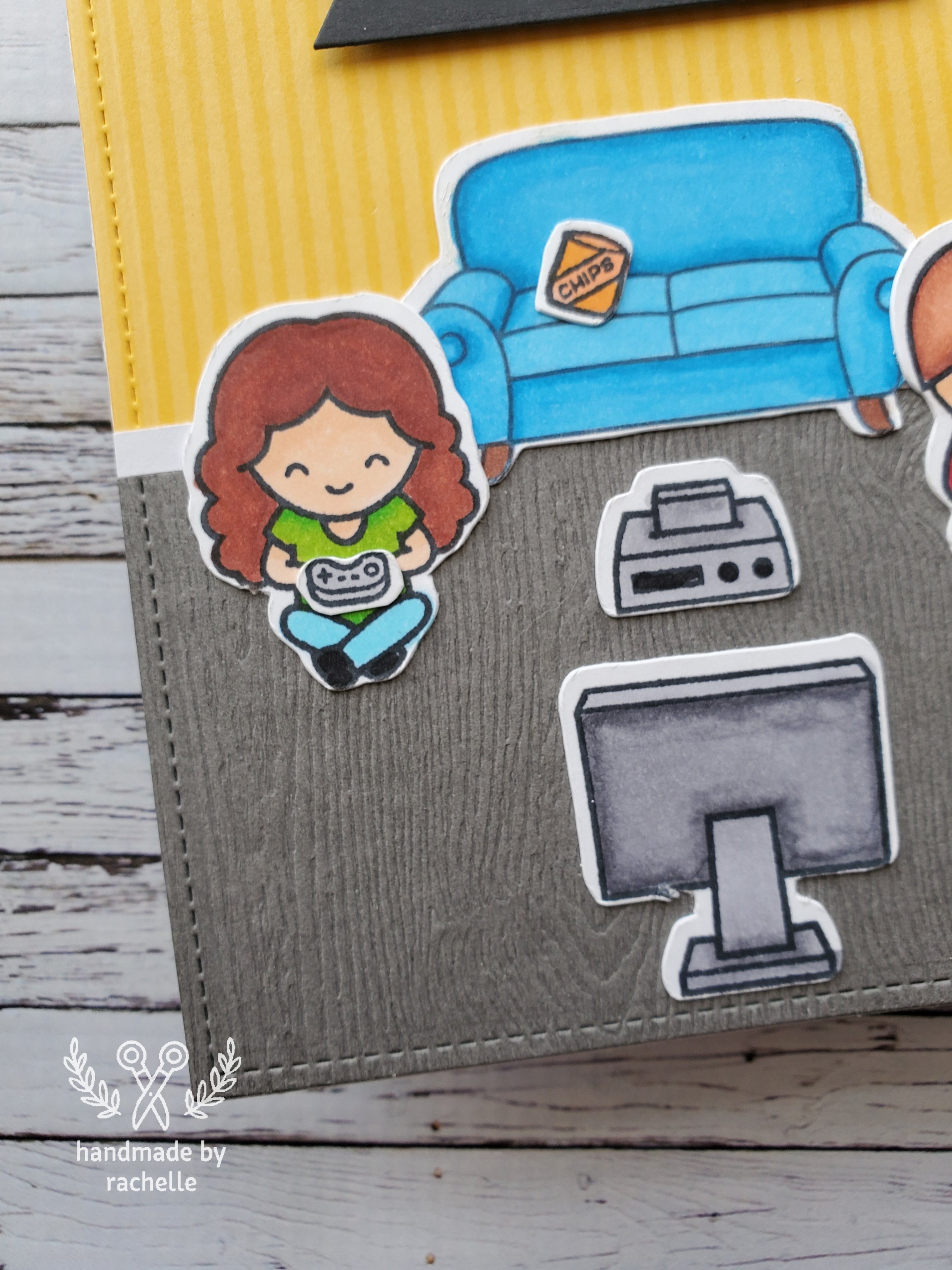This was my first time using the couch graphic in this card. This was created and shared by someone in one of my craft groups and I’m so thankful they did that! It was such a nice thing to do and they’re so talented to have made it! Lawn Fawn has yet to release a furniture stamp like this so it’s nice to have something to use.