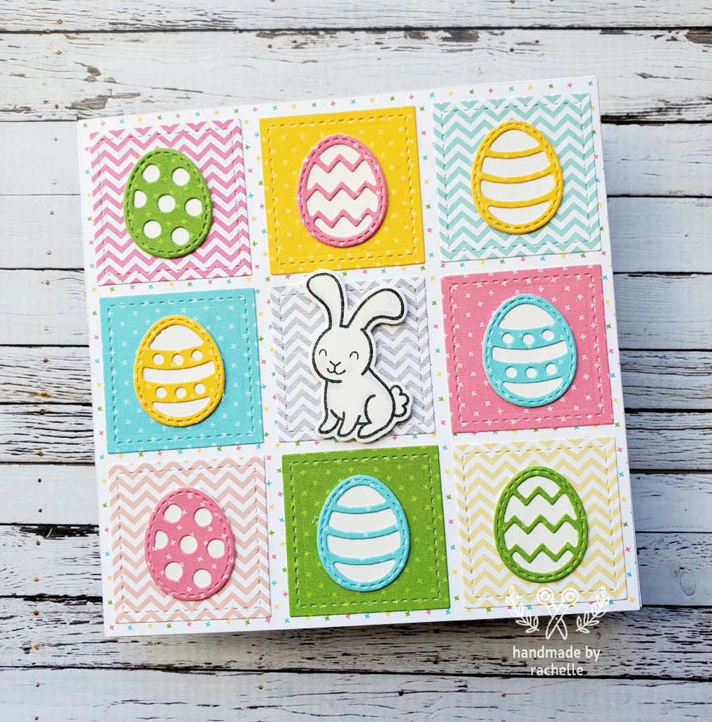 It took me awhile to plan out the papers and colors for this card. That’s something that has always taken me time but I’m getting better at it. The most fun part of this card was moving around all the eggs and papers until I found a layout where no same egg colors were next to each other, no same egg patterns were next to each other, no egg colors were on matching paper colors (the bottom left is close but I really like the way that one looks), and everything just looked right. It was a fun little puzzle!