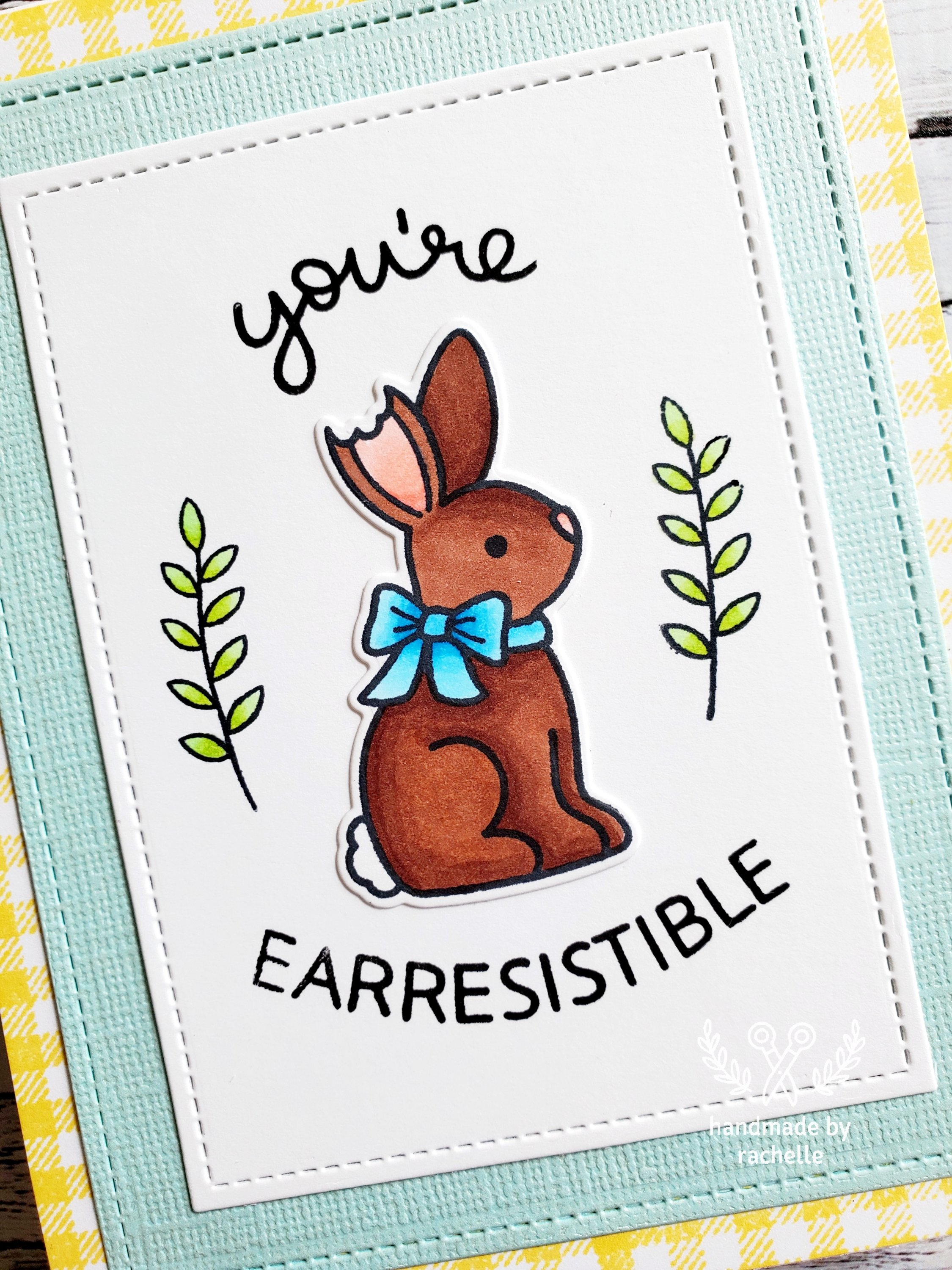 This was my first time using the Gingham Backdrop. I had to stamp it on one of the sheets that came with my MISTI, then stamp it on my card, and then move the card over and try to line up the design on the card with the stamped image on the MISTI sheet in order to make the rows match. It took me 6 tries (😄) but eventually I got it!