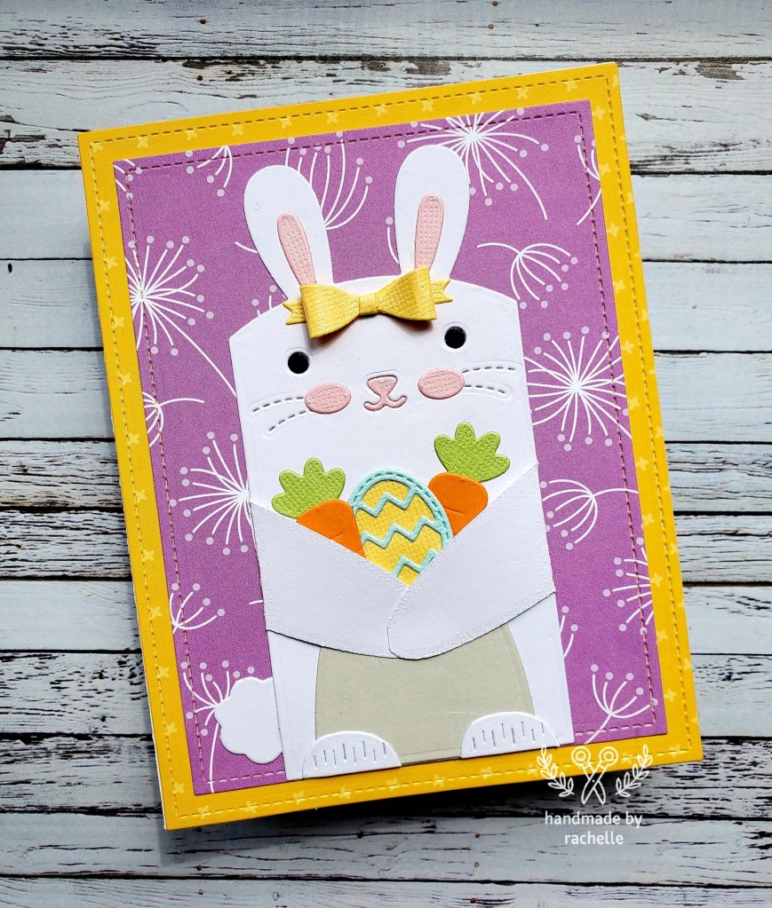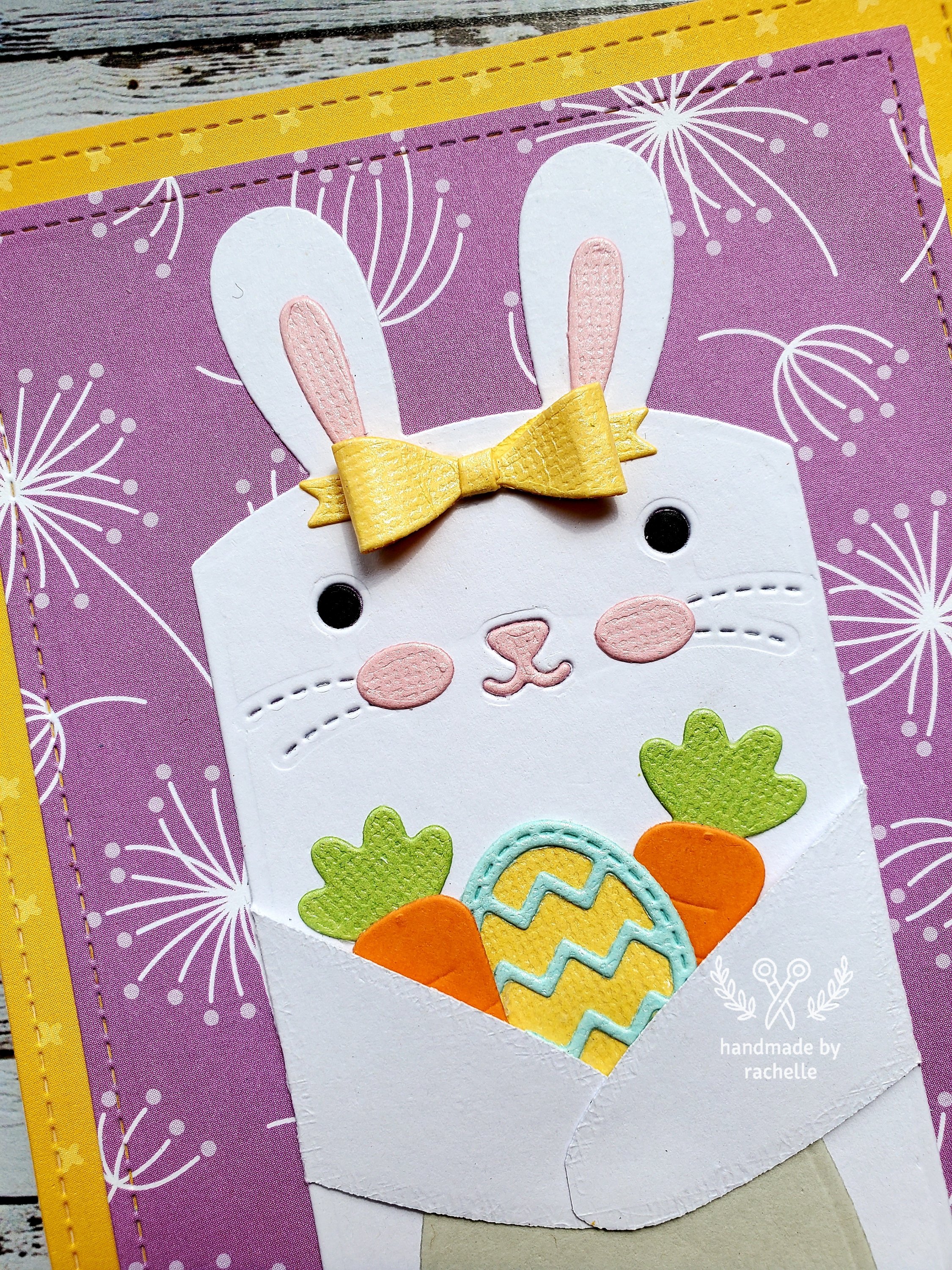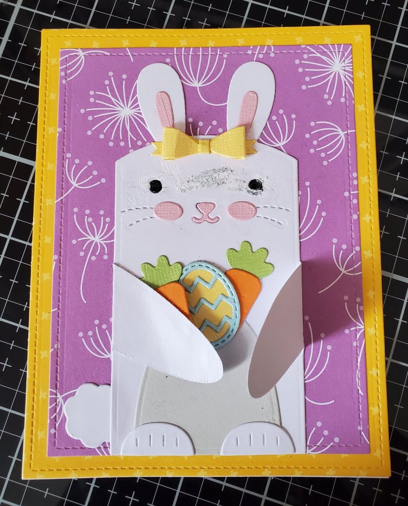 I tried scraping it off, buffing it off, covering it with a white gel pen… nothing worked. I finally decided to just make an all new card. Luckily this was a pretty quick card to recreate, and my bow even turned out better on the second card. 😊 Oddly I still haven’t been able to bring myself to throw away the ruined card. You can see I tried to pry up the arm and salvage the carrots or egg, but with no success. Oh well!