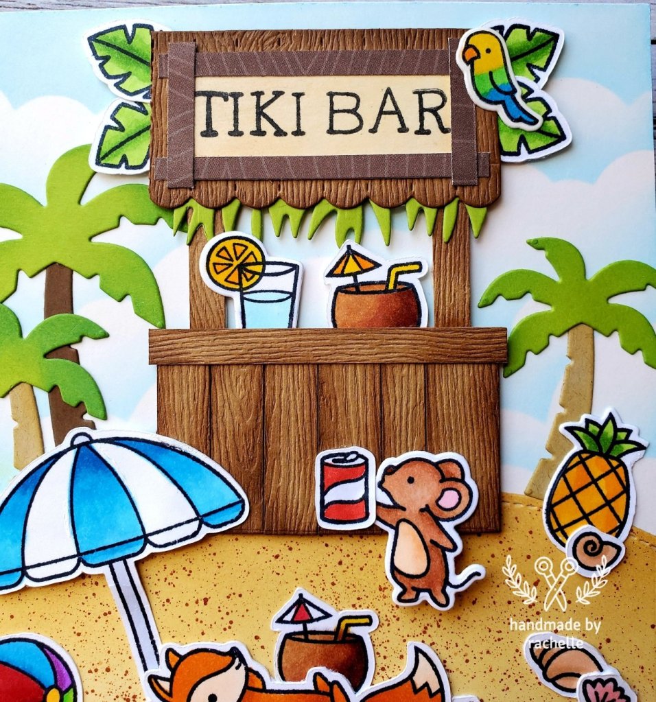 To make the Tiki Bar on this card, I followed the instructions by Tammy Stark from the Lawn Fawn Design Team. (She comes up with such great ideas!) I adjusted the measurements to end up with a smaller hut so that it would fit on a 5×7 card. I’ll include my changes below. To read her original instructions, check out the post on the Lawn Fawn blog here: http://blog.lawnfawn.com/2020/07/1-stamp-3-ways-with-tammy-7-17-20-on-the-beach/