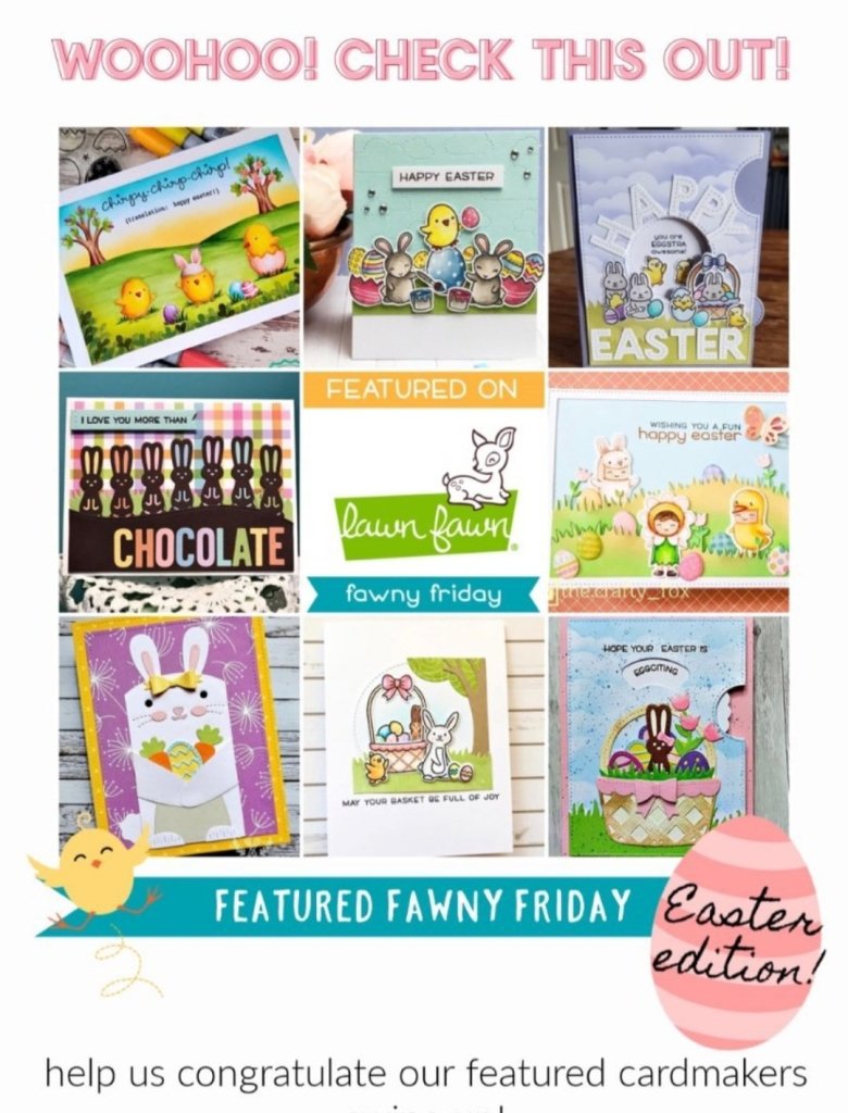 Yesterday I was featured on Lawn Fawn’s Fawny Friday and I could not be more excited!! My card is the one on the bottom left, with the Spring Critter Hugger. Here is the link to the blog post: https://blog.lawnfawn.com/2021/04/featured-fawny-friday-4-2-21-easter-edition/