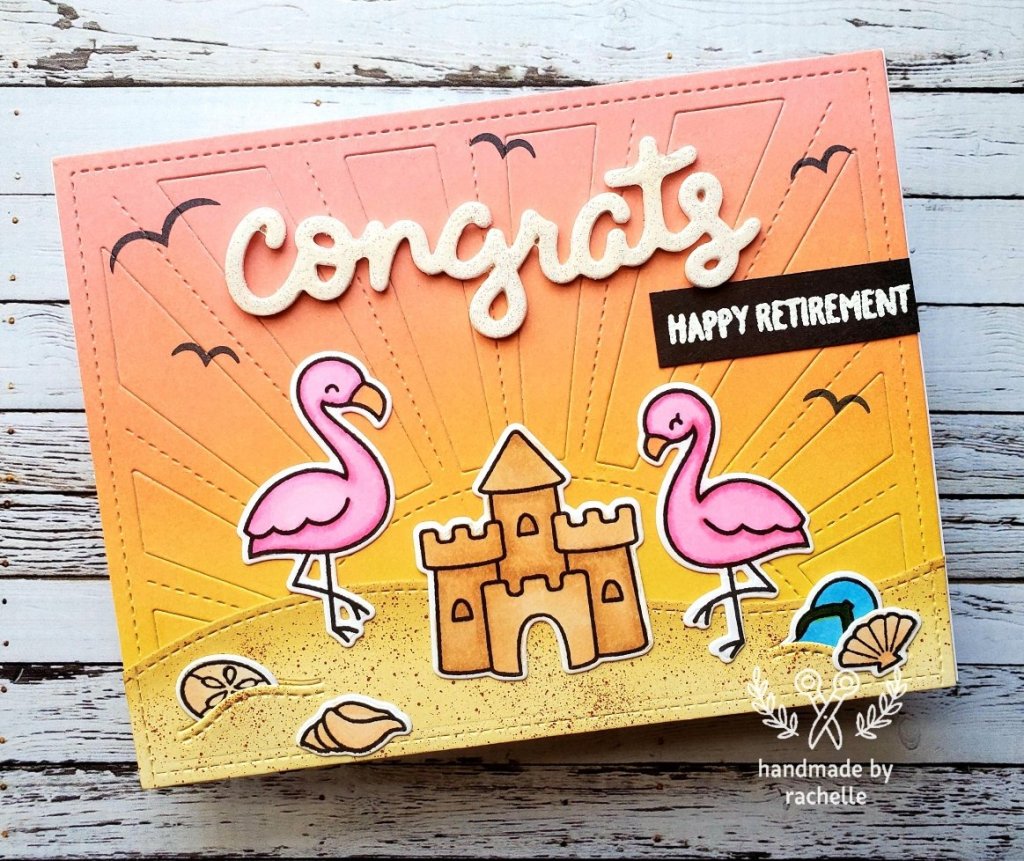 I couldn’t resist creating another beach scene! I recently got the Lawn Fawn Flamingo Together stamp set and I just had to use it. 😊 They look so cute and I have so many ideas for how I want to use them on more cards in the future. I also really love the seagulls in the sky! They’re from the Life Is Good stamp set by Lawn Fawn and I just think they add so much with subtle detail.