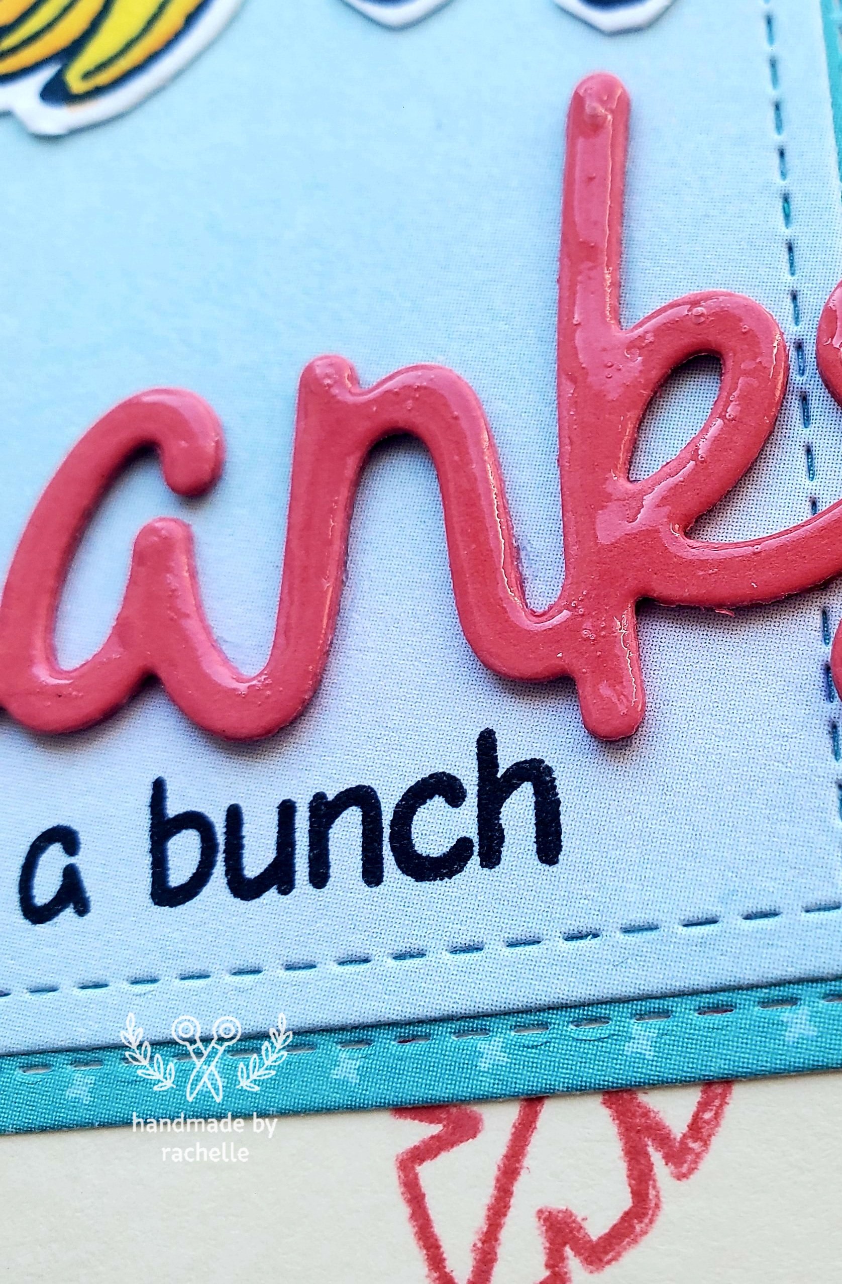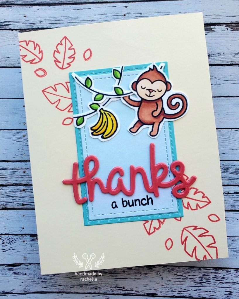 This is an old design by Chari on the Lawn Fawn Design Team but I just loved the pink leaves on the corners and had to remake it. I had a hard time positioning the monkey so that he wasn’t blocking the letters of the Thanks die, and if I make this card again I would try and move things around so that he’s more sideways and looks more like he’s swinging on the vine. But still a cute card overall!