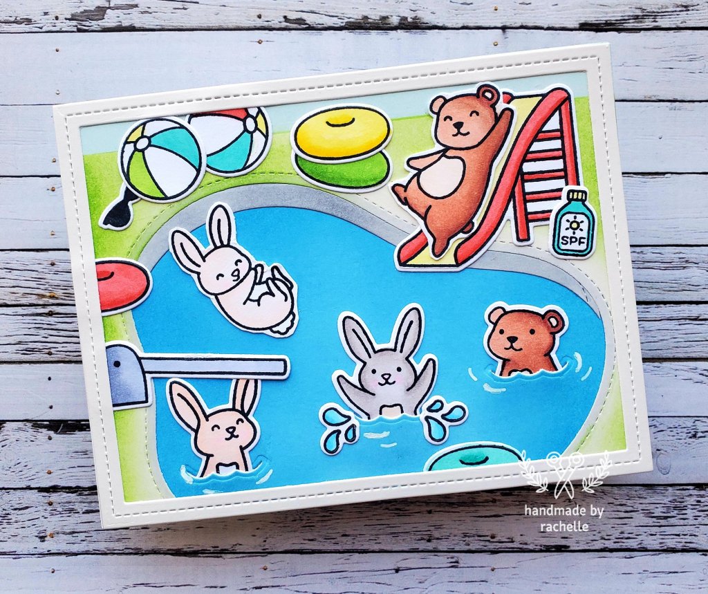 First, cut the pool shape using the Stitched Pond die. Next, take the inside “pond” piece that was created in the first step and lay the Stitched Pond Frame die on top of it. You want to line up the edges and then move it down so that it’s offset. I recommend moving it down a good amount. Run that through your die cut machine and you’ll get the little edge piece you need. Take that little edge piece and place it inside of your pool shape. Finally, slide that little edge piece behind the pool shape until the stitching is no longer visible. This is why I recommend offsetting that piece a good amount when you die cut, so that you have a big piece to work with as you slide the piece out of sight. If the edges are visible, you can cover them up with critters or other things later on. And that’s it!