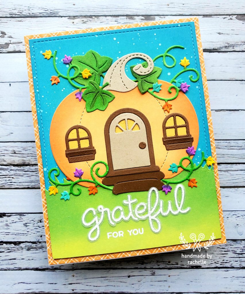 Megan Quinn made a beautiful card design that I loved, so I had to recreate it. She had fancy copic coloring on her house but my skills are not there yet, so I just used ink blending. I do love how the color of the pumpkin looks against the colors in the sky.