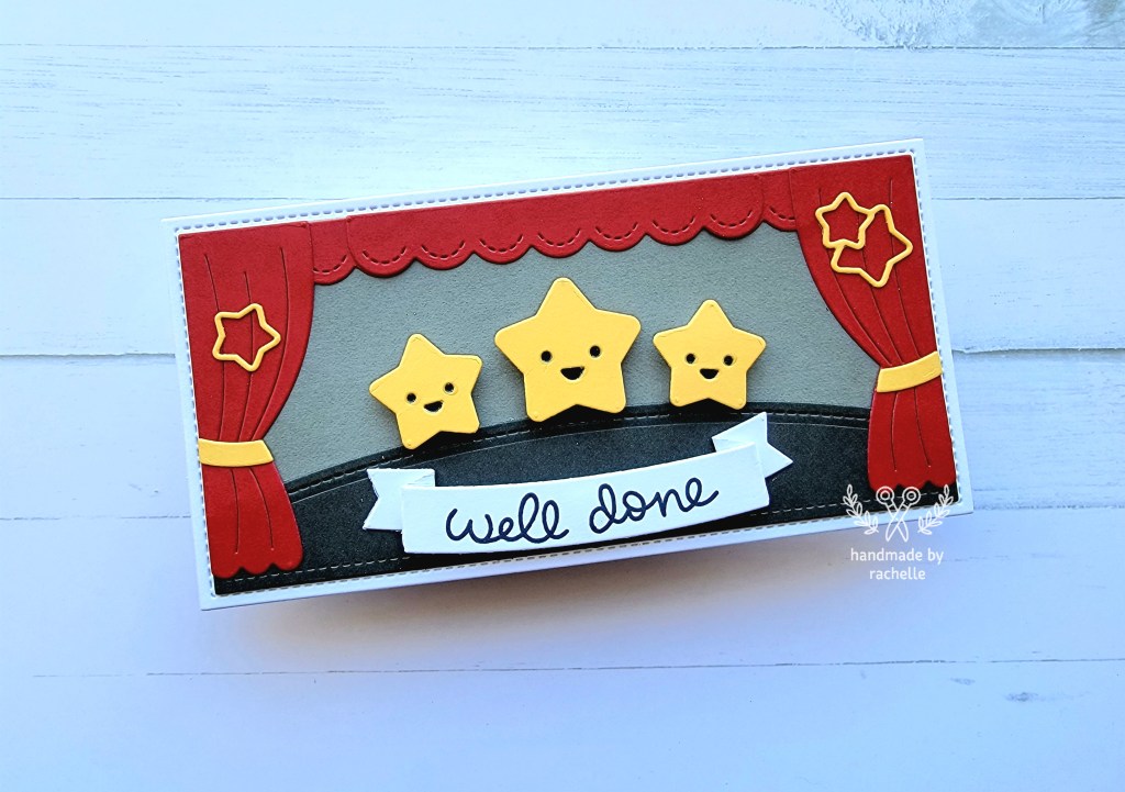 I wasn’t sure if I should even post this card because it’s so simple but I like having a record of my cards, and I do still like it. I like how this set fits on the slimline card but I wish I would’ve done some partial die cutting to extend the length of the curtain on top and make it look more seamless. I also kept wanting to add something more to the scene but wasn’t sure what. This is why I prefer to recreate designs and change them up a little – it takes me way too long when I try to work from scratch!