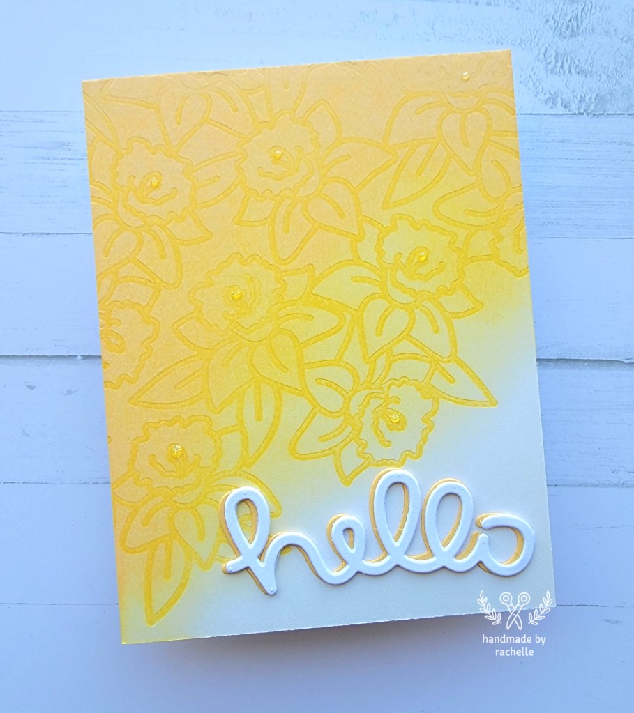 I was inspired to try this technique when I saw Mindy Eggen post about it. I used the same stencil she did (Off the Edge Daffodil by Simon Says Stamp) and it’s such a pretty stencil. I will say, I’m used to Lawn Fawn stencils, which feel much more hardy/substantial, and this one was incredibly thin and delicate. But the design is still so pretty.
