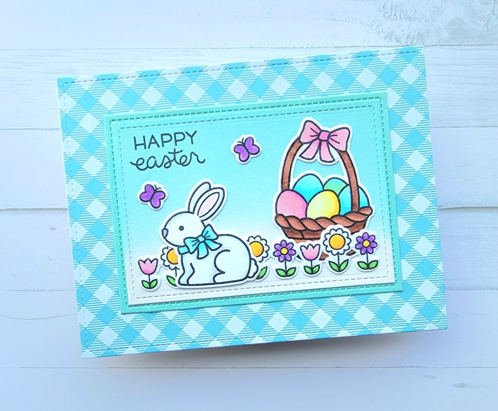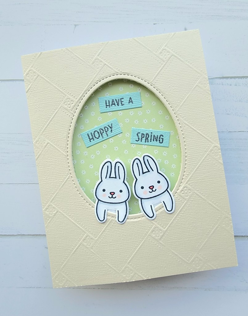 This card could really use more added to it but I wasn’t sure how to do it with the egg opening. I also should’ve cut out the Easter egg shape first and then embossed afterwards so that the embossing didn’t get smushed down, but I was worried about getting the egg opening lined up correctly with the card base. I could’ve traced out where it should go though and that would’ve solved the problem. Next time!
