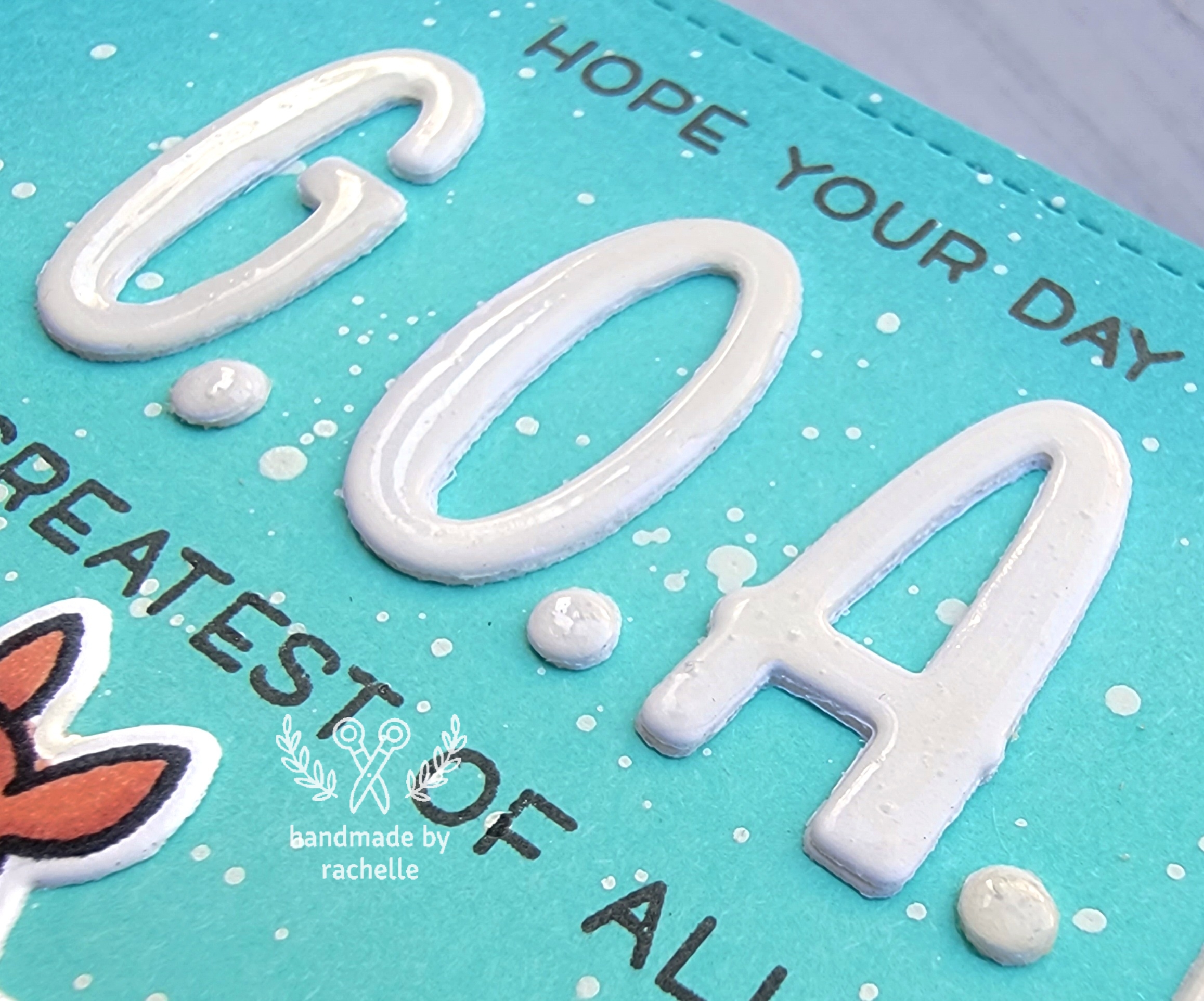 The hardest part of this entire card was stamping “THE” in that top line. In the stamp set, the word “the” is in a bigger font as part of “THE G.O.A.T.” But on my card it would look pretty strange if only the last word in that line was suddenly way bigger than the rest. So I stamped the first part of the sentiment as normal and then I stamped only “THE” from the “HAY THERE” sentiment included in the set, since it was the same font size as the rest of my sentiment. I placed tape over the other letters when stamping on my ink pad and then removed the tape when I stamped on my card. It’s a little tough to get exactly the right placement for where to stamp like this but it worked out! I did end up with the tiniest spot of ink from the letter R that snuck onto my card next to the E, but I was able to use my white pen to cover it with a small white dot and that made it look perfectly like it was part of my splattered background. The person who receives this card will never know all the work and care that went into just that one tiny part! 😄