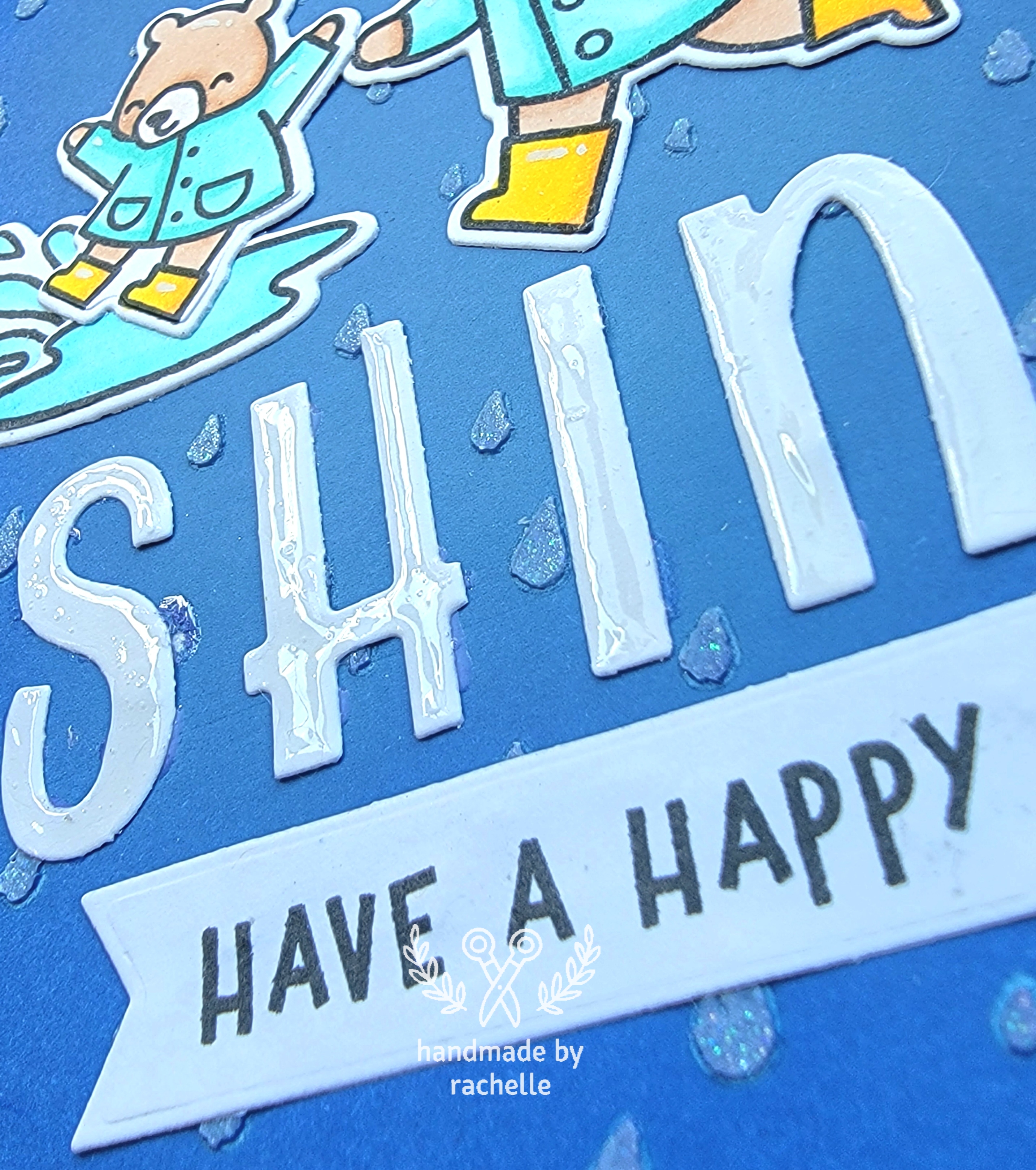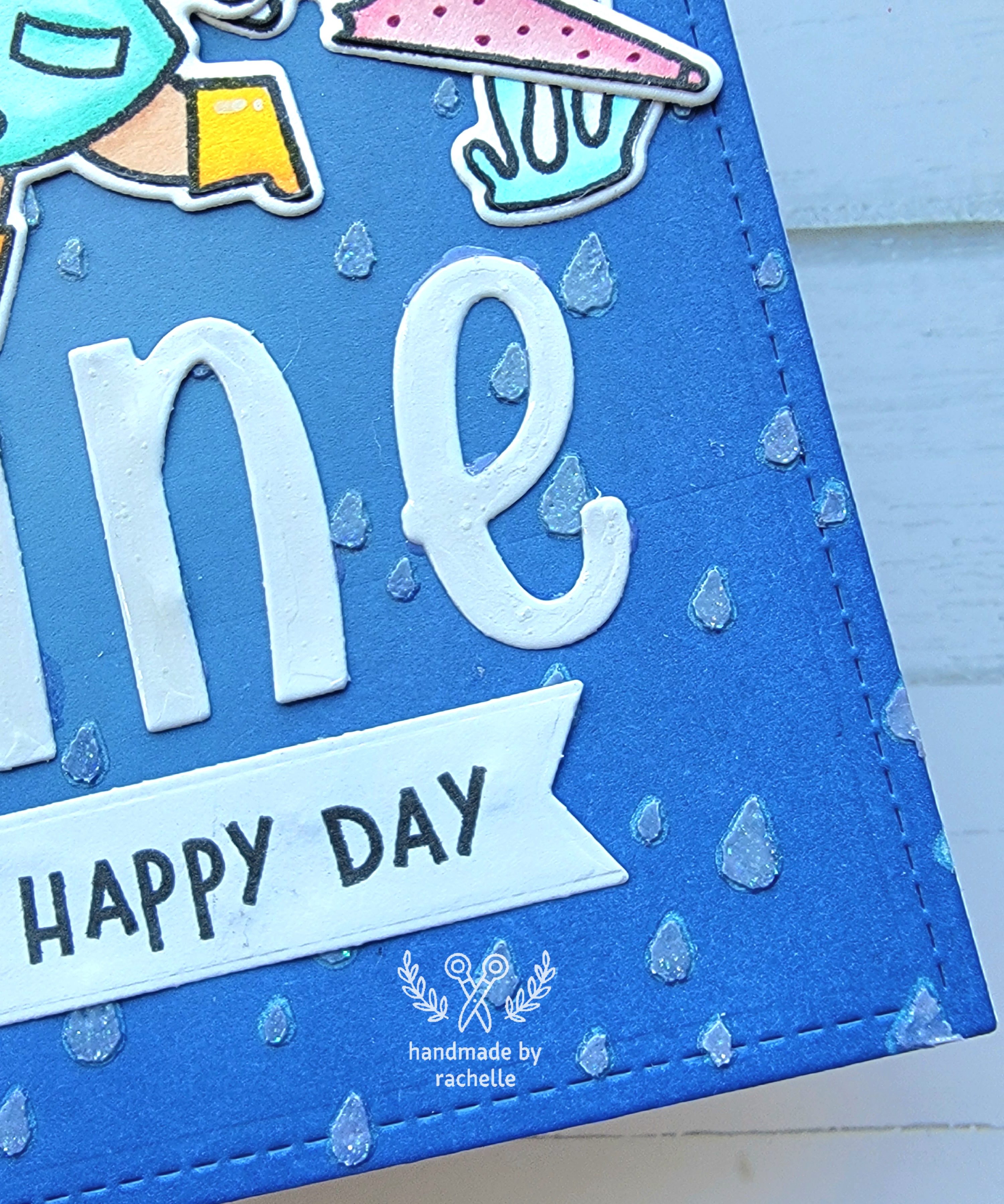 One addition this time was that I put glossy accents over the letters, and it is hands down a better look this way. For a rainy card it just makes the letters look wet and it’s perfect.