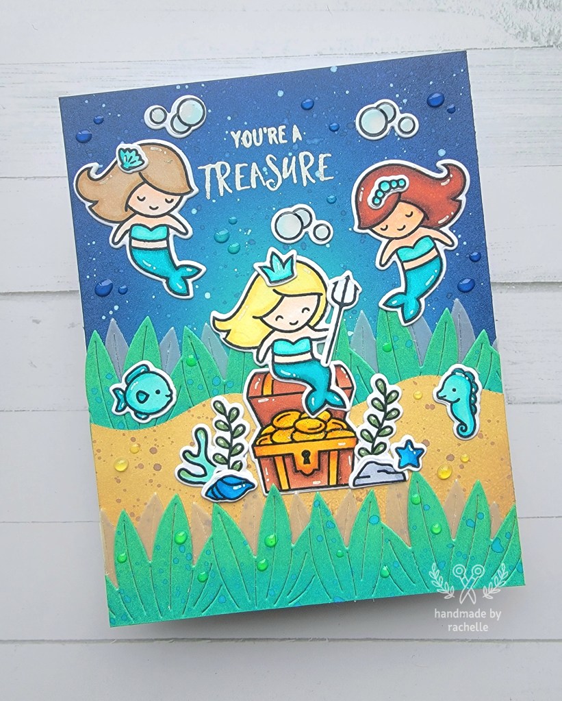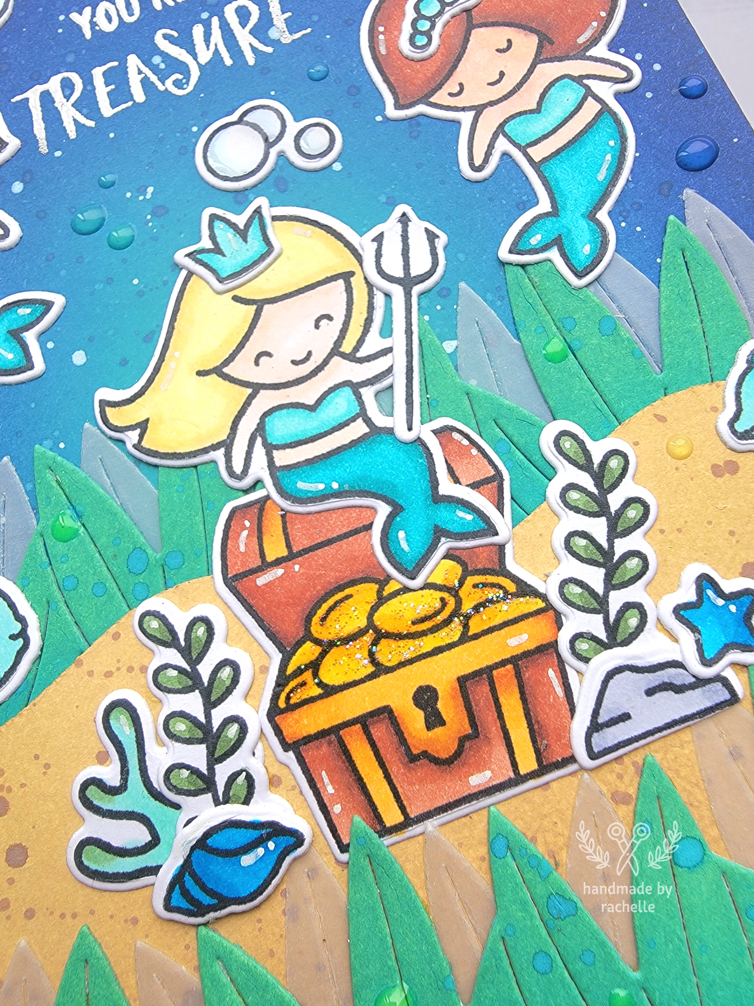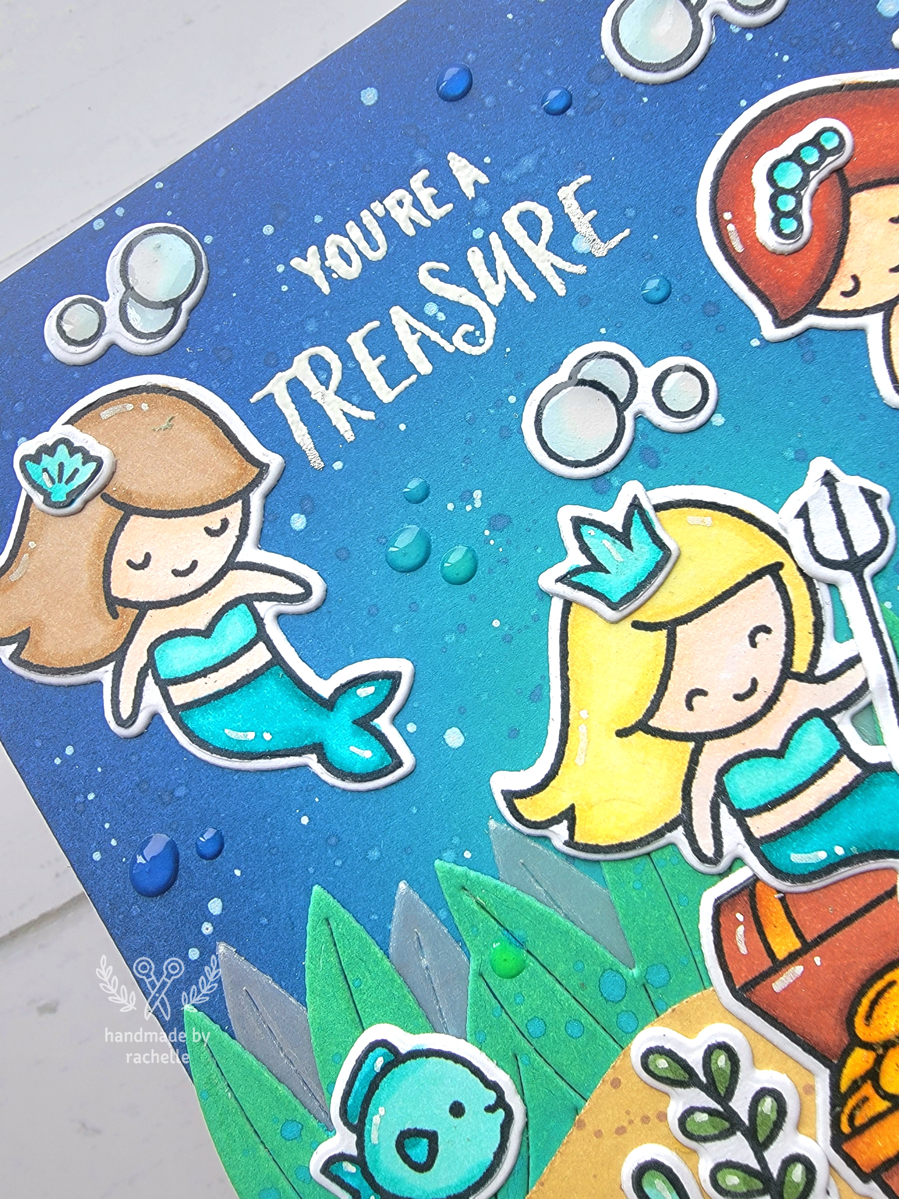 • Distress oxide inks for leaves border: Lucky Clover, Peacock Feathers, splatters of Mermaid Lagoon