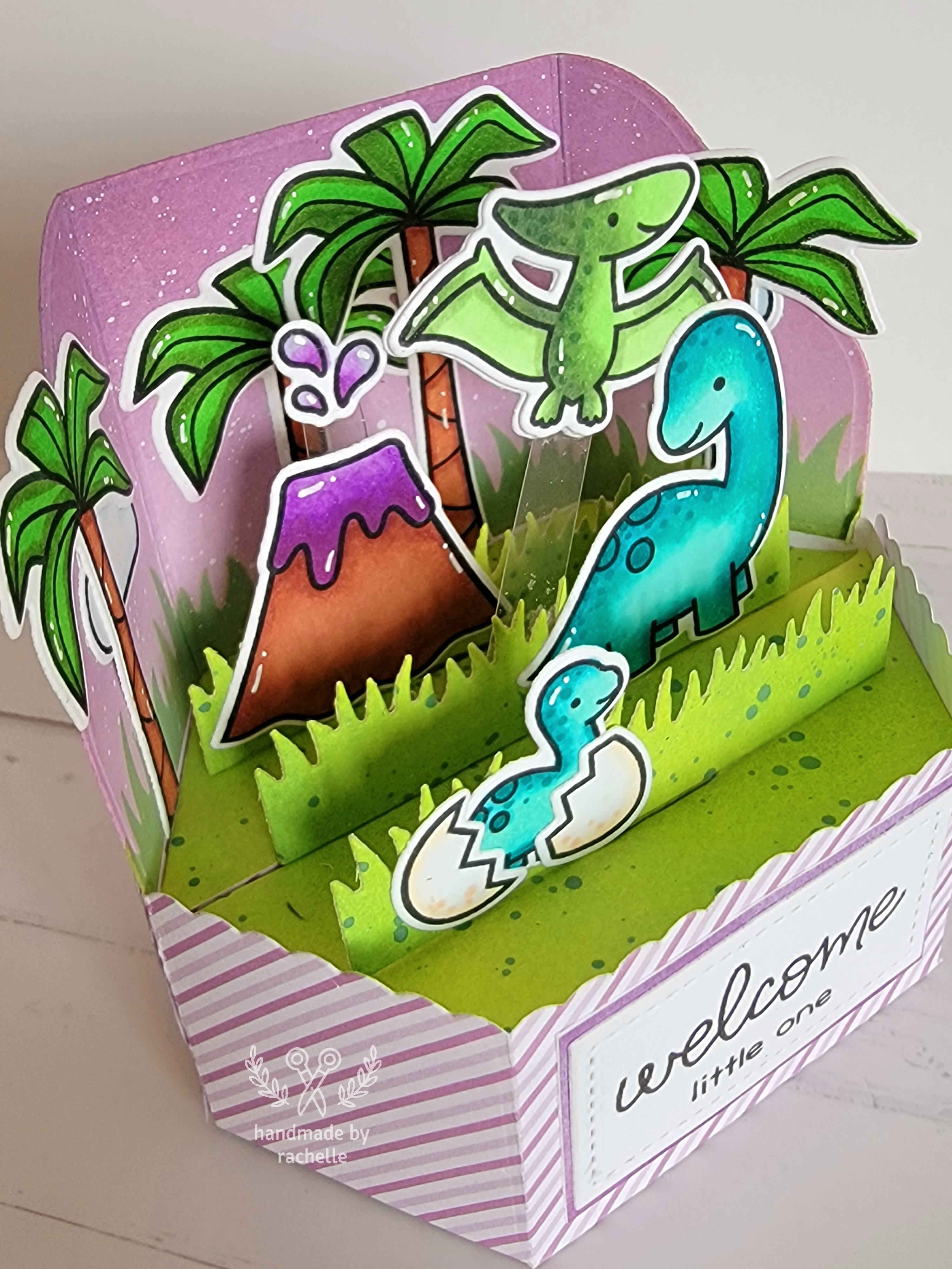 I had a request for a dino-themed baby card and I’m so happy with how this turned out! I was inspired by a card Tammy made. The Platform Pop Up is just an incredible leap forward for card making I think. It’s so much better than the box pop up cards; somehow having that “floor” makes everything way more awesome. Almost every design is better as a pop up like this!