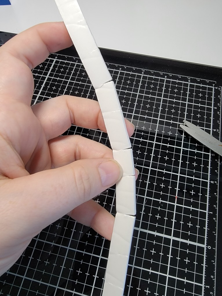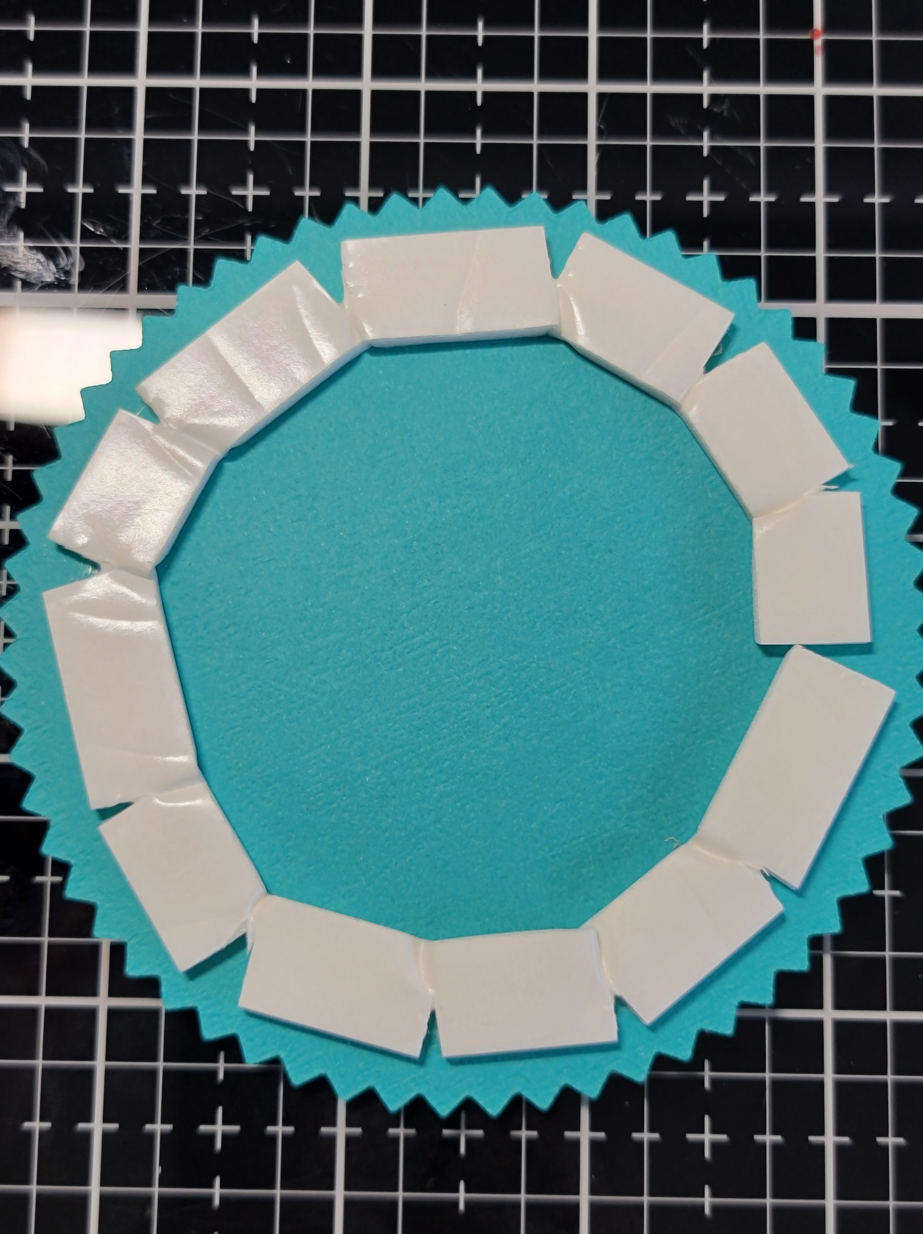 A small tip for adding foam tape to a circle shape: take a long piece of tape and cut into it at many intervals, but don’t cut all the way through. Then you can bend the piece around the circle and fill up the space perfectly, and when you remove the backing, it still all comes off in one piece. Very helpful!