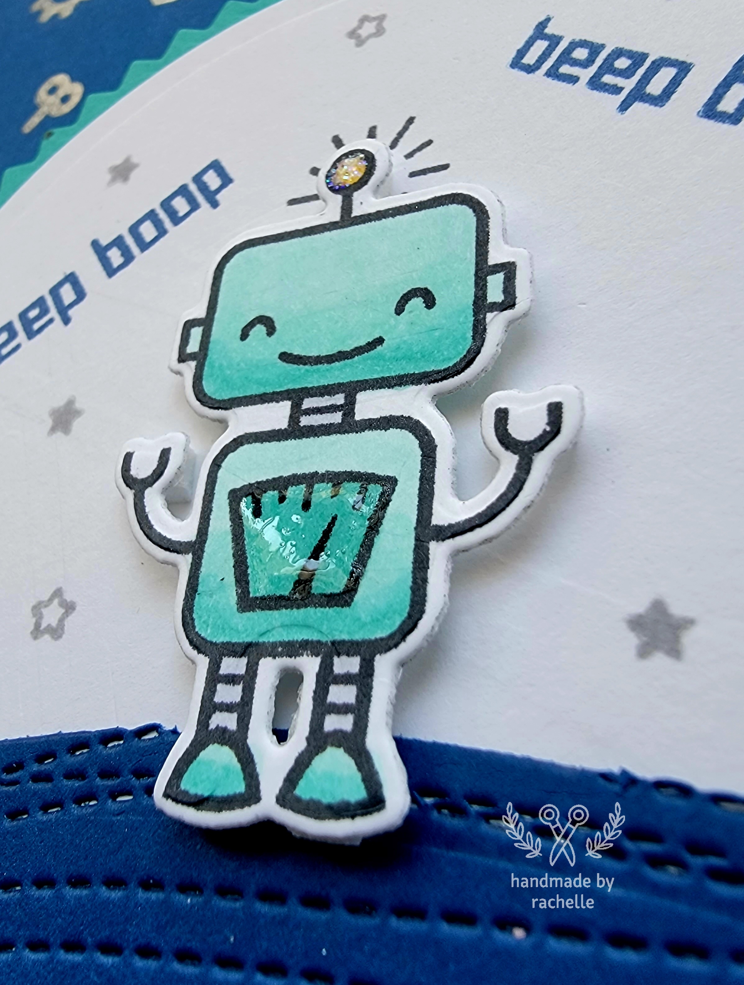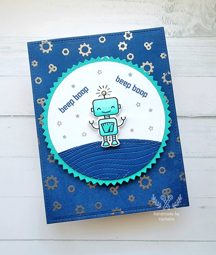 This card is very similar to the other robot card I made recently. Originally I was going to use a background stencil with some silver stencil paste… but after FIVE, yes, FIVE attempts, the stencil just would not cooperate. The stencil paste kept bleeding through and ruining the card base. The stencil also had a few delicate sections that were tricky to work with. The cardstock also kept getting ripped in a few spots and what I think was happening was that the stencil paste was beginning to dry, and then when I pulled off the stencil, those areas pulled off the cardstock too. Needless to say I was not a happy crafter. I’m going to give the stencil one more try by using some Pixie Spray with it (and I guess by going really quickly before the paste dries) and we’ll see how that goes. It might be awhile before I’m ready to try that stencil again though, ha!