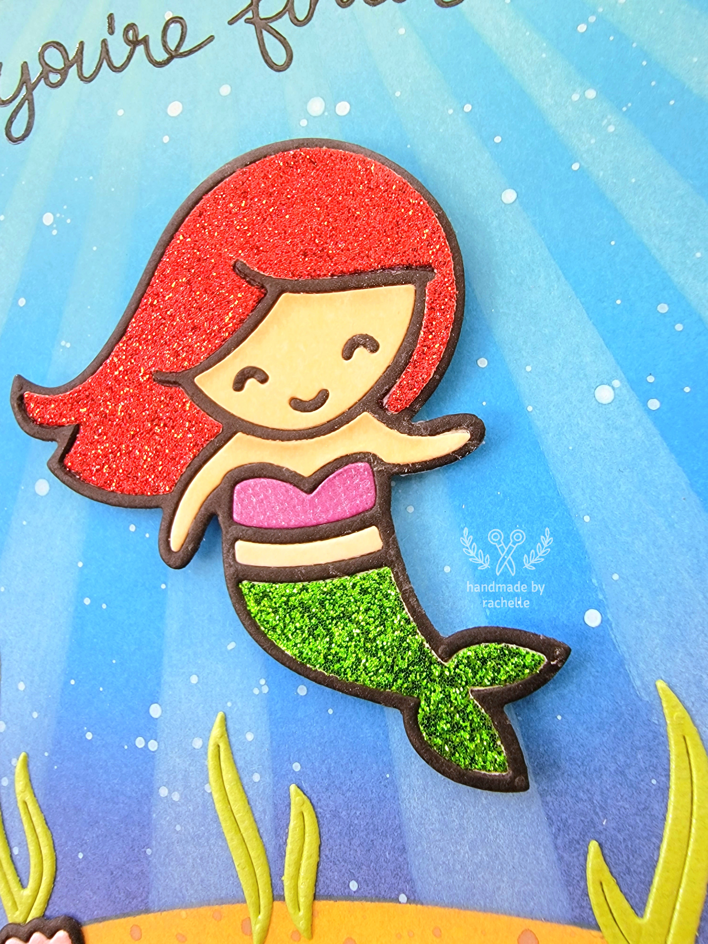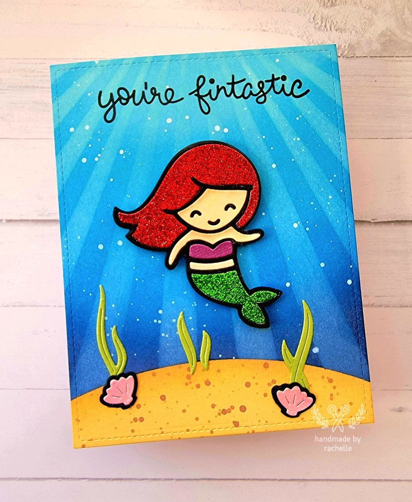 I really love the way this card turned out. The sun ray stenciled background is just so pretty, and then to have the nice sparkles popping out on the mermaid, and to top it off with the embossed sentiment looking all shiny and 3D, everything came together so well.