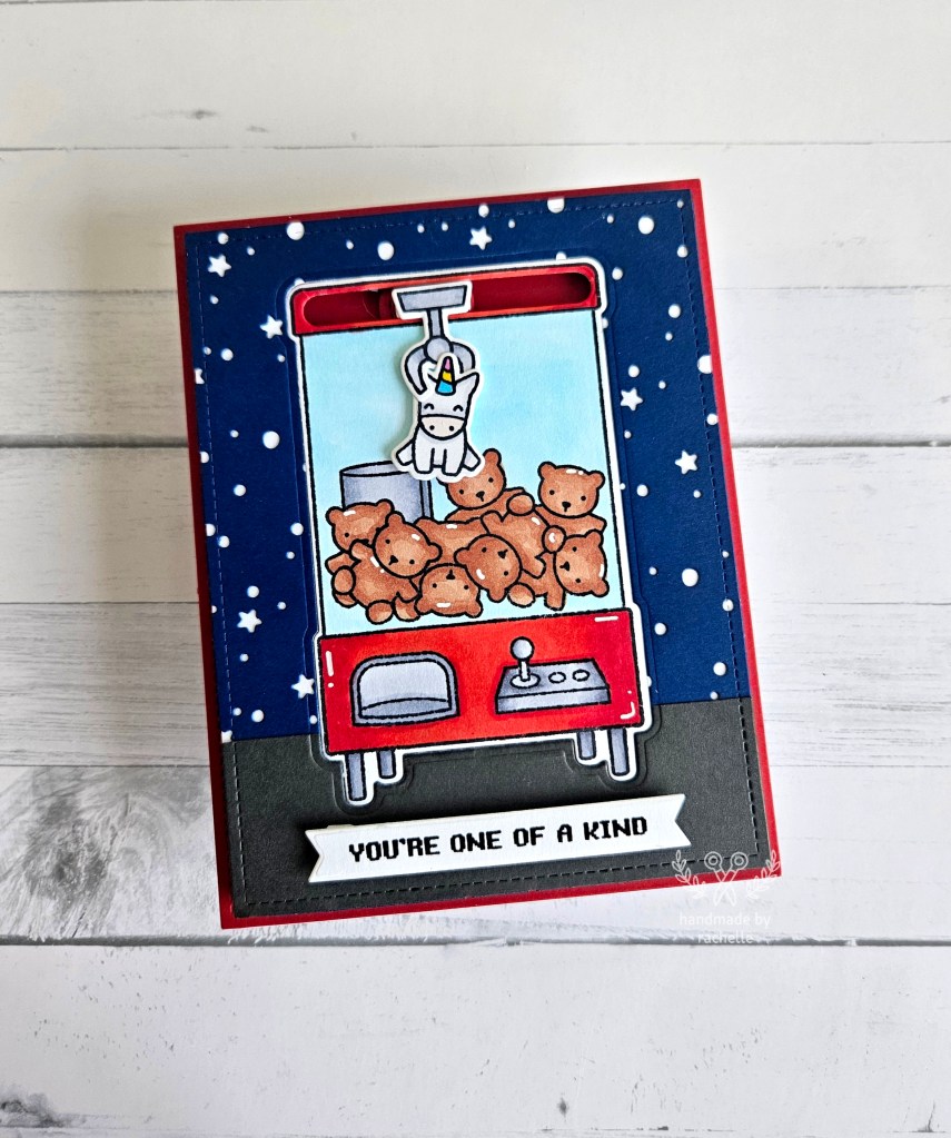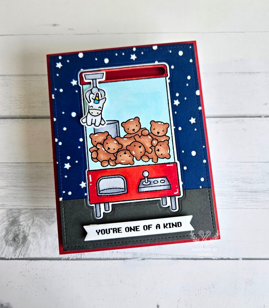 When I made this I first cut out the Snowy Starry Backdrop and glued it to a piece of white paper, and then cut them with the Outside In Stitched Rectangle. Then I cut out the hillside and attached it to the backdrop for the floor. Then I took just the die for the claw machine and cut out that shape from the whole background piece at once. My die cut machine cut through all those layers pretty cleanly and then I think I needed to pull a few spots at the end, but it worked.