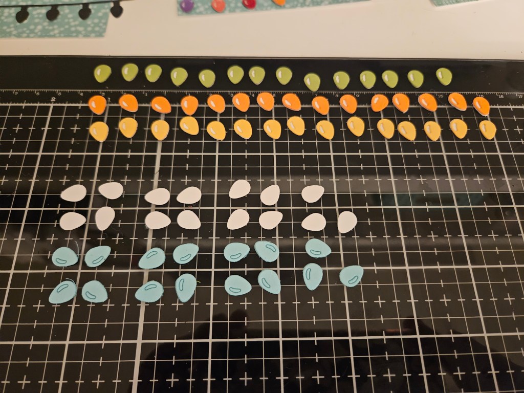 In hindsight I should have cut the strings out of white so that the back of each light bulb would already have the white showing through it and I wouldn’t have had to spend time cutting out and attaching all those extra white bulbs. And then it would have been super fast and easy to just color the strings black with a marker. I can’t believe this didn’t occur to me until right now looking back at these pictures…. Oh well, next time! 😄