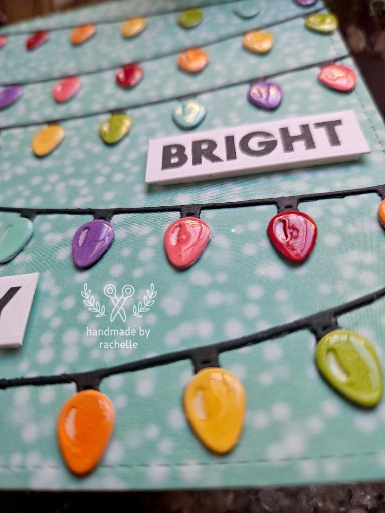 This design was inspired by Chari. I made 4 of these cards this year and it definitely took some patience die cutting and attaching all those little bulb pieces! But with the glossy accents on them it looks so good. I love how bright and festive it is!