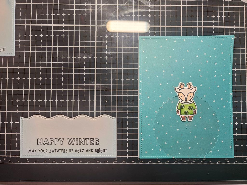 I laid the pieces down with the acetate reveal wheel hanging a bit off the bottom of the card, since that’s how it would eventually be placed in order for the recipient to turn the wheel. This was how I figured out how tall to cut the snow border piece on the left in the picture below.