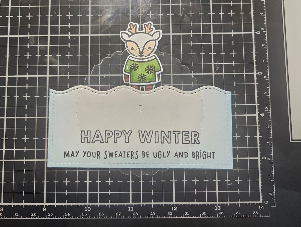 I took this snow border piece that would end up being the bottom of the card and I measured it and made a small mark to find the middle point of the card. If you look closely at the picture below you’ll see the pencil mark I made.