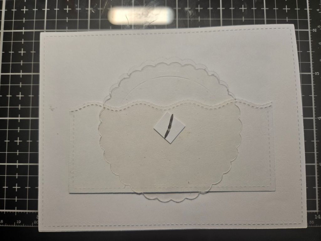 Then I moved everything out of the way except for the snow border piece and I used a piercing tool to poke a hole through the card right on the mark where my pencil was. I then put a mini brad through that hole.