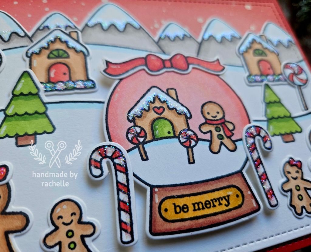 I think this was my favorite holiday card that I made this year. I was inspired by a shutter card that Megan Quinn had made and I liked the idea of a pink sky. I added sparkles to the mountains, all the candy pieces, and a few other spots, and in person it is really pretty to see everything glittering.
