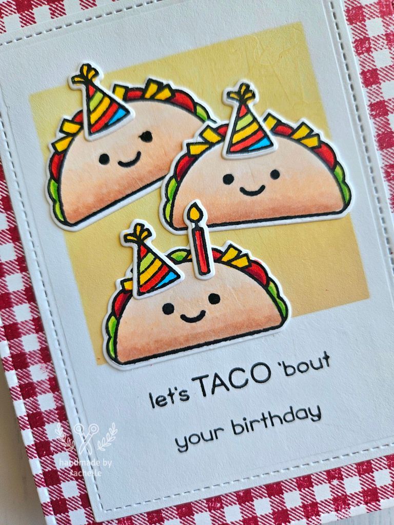 I made a version of this card years ago with some patterned paper and always wanted to make it again, but I didn’t want to buy a whole pack of checkered paper when I really only wanted the red checkered pattern. (If only a craft company would sell just red checkered paper in a pack, and not a rainbow of colors!) The original card was here: https://handmadebyrachelle.com/2021/05/04/birthday-tacos/