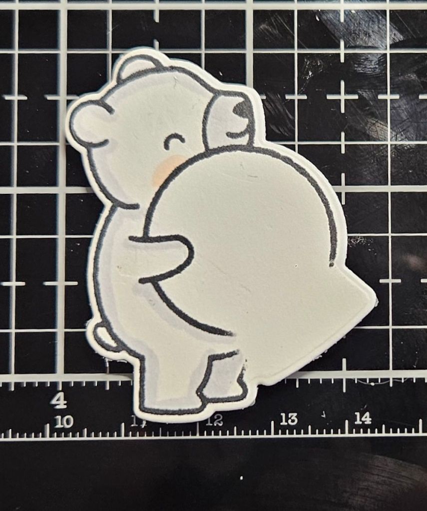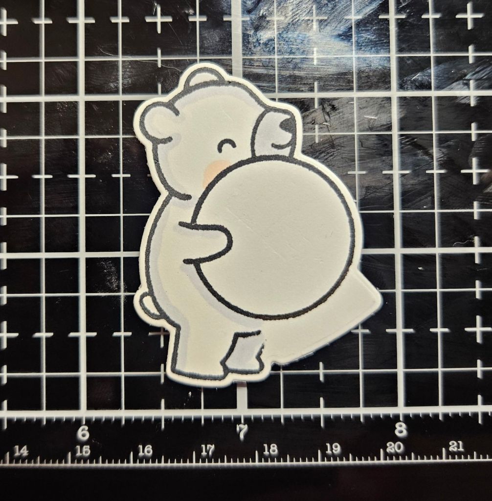 6. Cut away the extra area. To make this card I also cut in towards the bear a little more following the circle line, so that I could tuck in the die cut for the bottom circle of the snow man and hide that spot by his feet where it cuts in sharply.