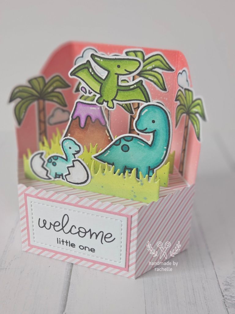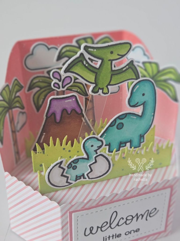 I made a pink version of a baby card I made previously. The first version with all the supplies listed is here: https://handmadebyrachelle.com/2022/06/01/dino-platform-pop-up/