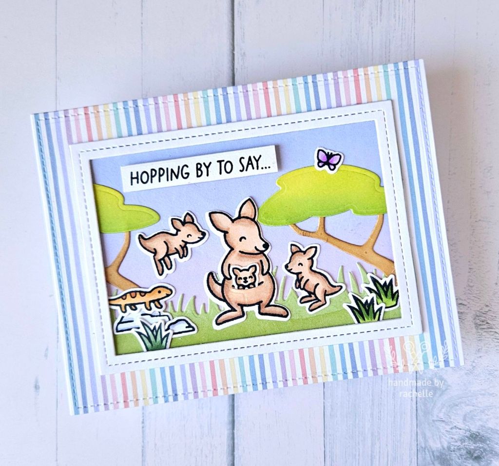 this kangaroo card is soooo cute! LOVE the soft colors! and love the ink blending on the trees! thank you so much for playing along with the Lawn Fawnatics Challenge! 🙂