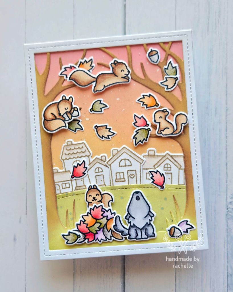 This was a design by Grace that I recreated. I just loved the soft colors and the depth she created using the houses as a background. The link to her original card is here: https://blog.lawnfawn.com/2023/10/a-beautiful-fall-scene-with-grace/