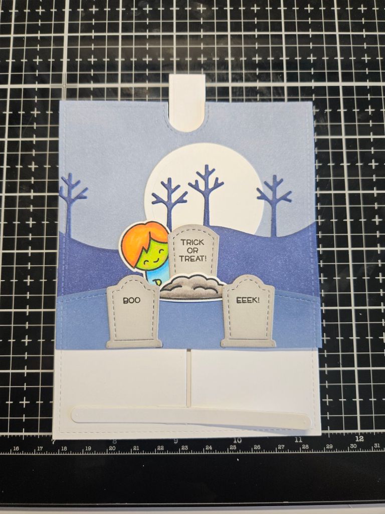 This is where assembling the card can get a little tricky. I laid the front piece down (with the grass clumps) over the background sky piece. After measuring how much of the background that front piece would cover, I cut off the bottom of the background sky piece as high as possible while keeping the cut hidden. I then attached the remaining 2 gravestones to the background sky piece so that they were in line with the dirt mounds on the front piece.