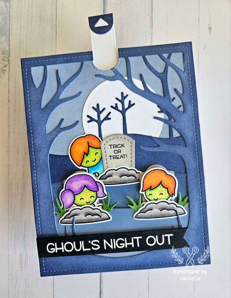 I then cut out the Spooky Forest Backdrop and ink blended it with Chipped Sapphire and Faded Jeans. I cut a notch in this piece as well with the Let’s Toast Pull Tab set. I attached this to the front of everything.