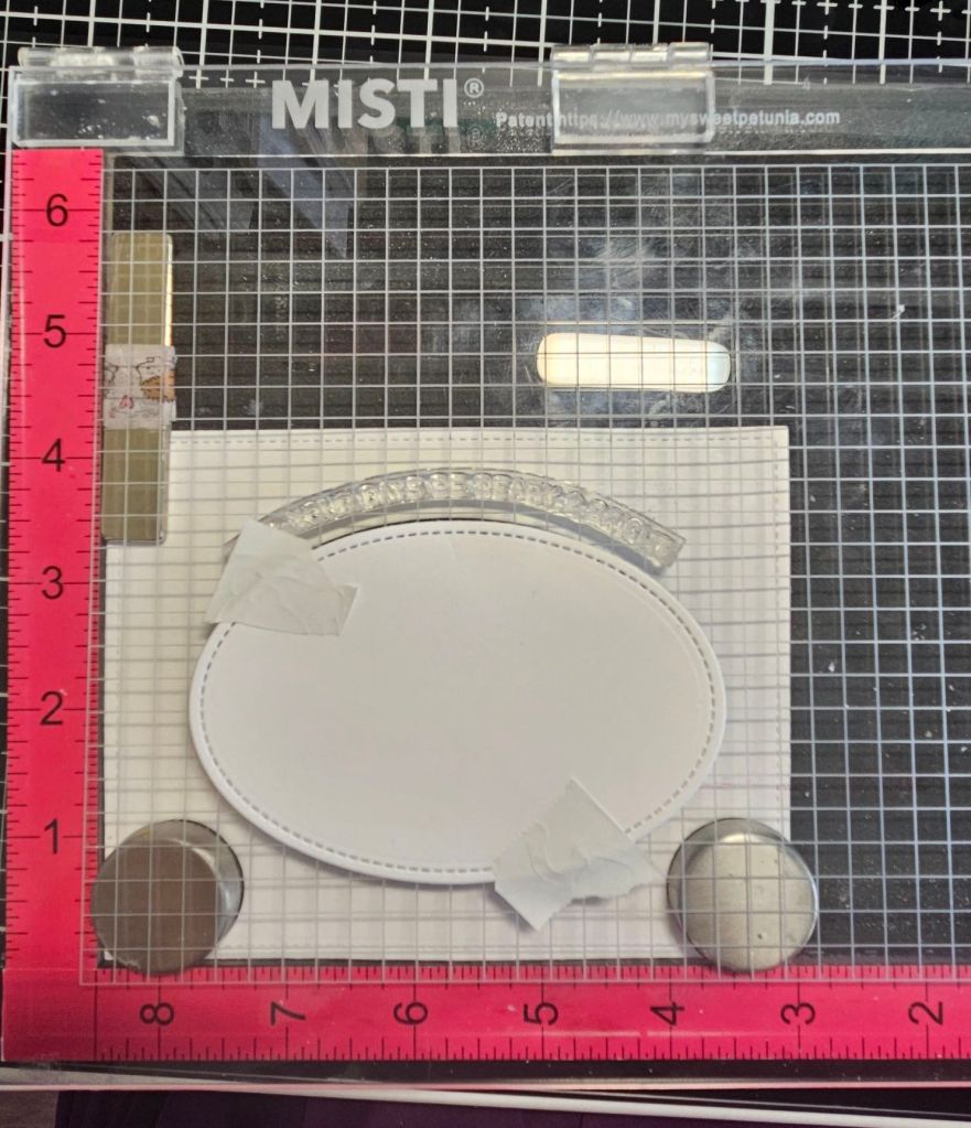 Maybe the hardest part of this card was curving the sentiment at the top to match the oval shape. There might be an easier way to do this, but this is how I did it: