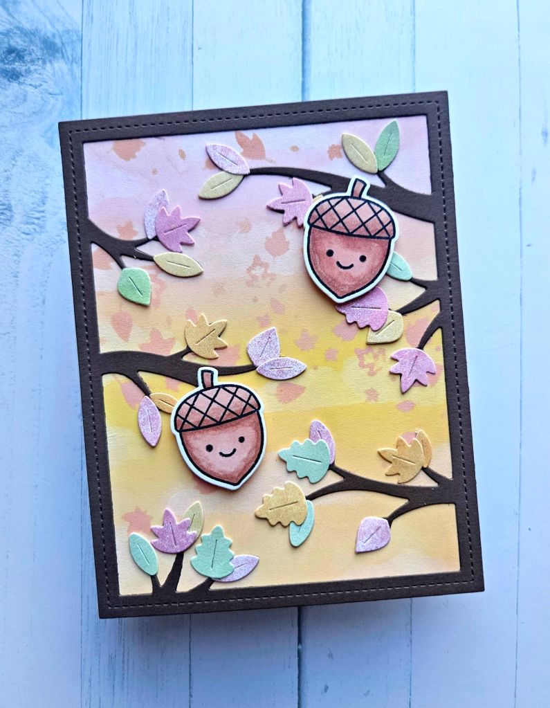 This was my first time trying out not only the Tree Branches Backdrop but also the Stratus Cloud Stencil and Autumn Breeze Stencil. I don’t know that I like the way they look together but it was worth a try. I also had thought I stamped enough acorns for each card to get 3 instead of 2 so they ended up a little more bare than I intended, but oh well.