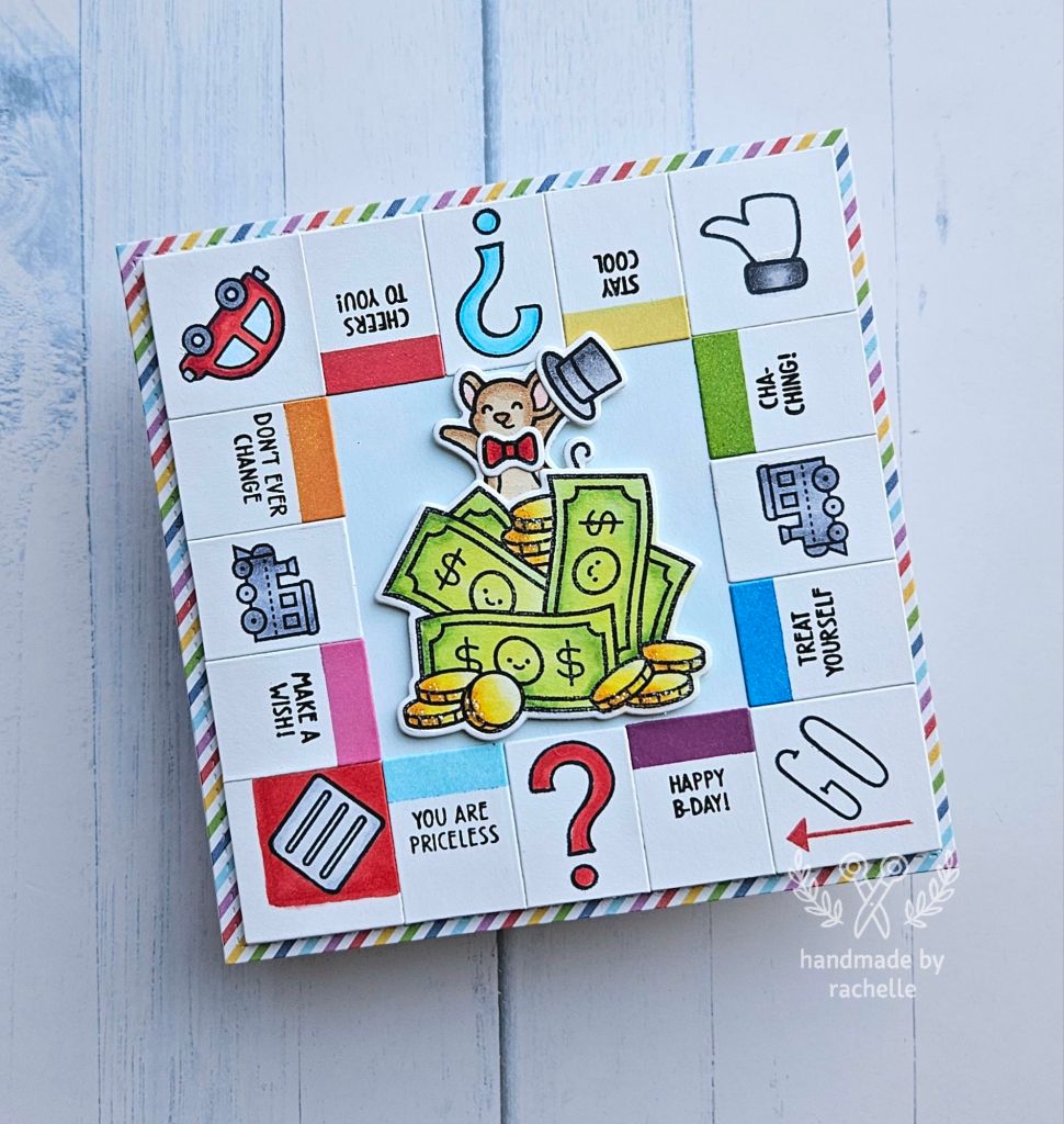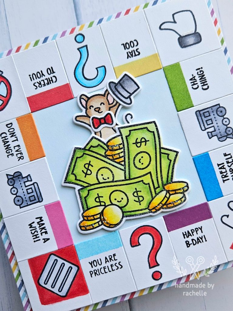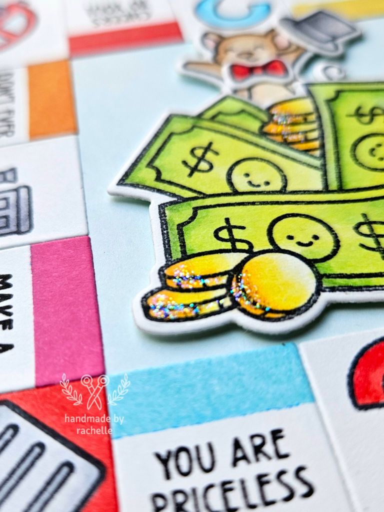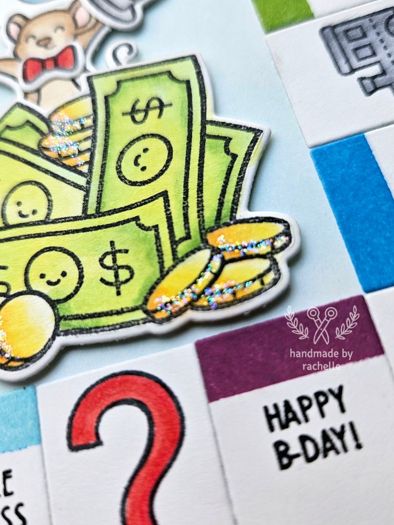 Catherine stamped and then die cut her images, and she did a great job recreating the look of the old-timey car on the original game board. I wanted everything on my card to be a single layer except for the mouse and the money in the middle, so I stamped directly onto the game board pieces instead of die cutting them. I used an image of a more modern car from “Happy Village” for the free parking space and I really like how perfectly it fits into the square. She used a pointing hand image from one of the planner sets that I don’t have for the “Go to jail” space, so I used a thumbs up image from “# awesome” instead and I think it works just as well. I also used a few different phrases around the board, a different alphabet set for the word “Go”, and I added some sparkle to my coins just for fun. 😊