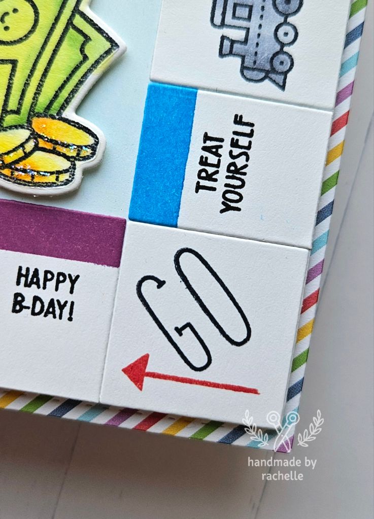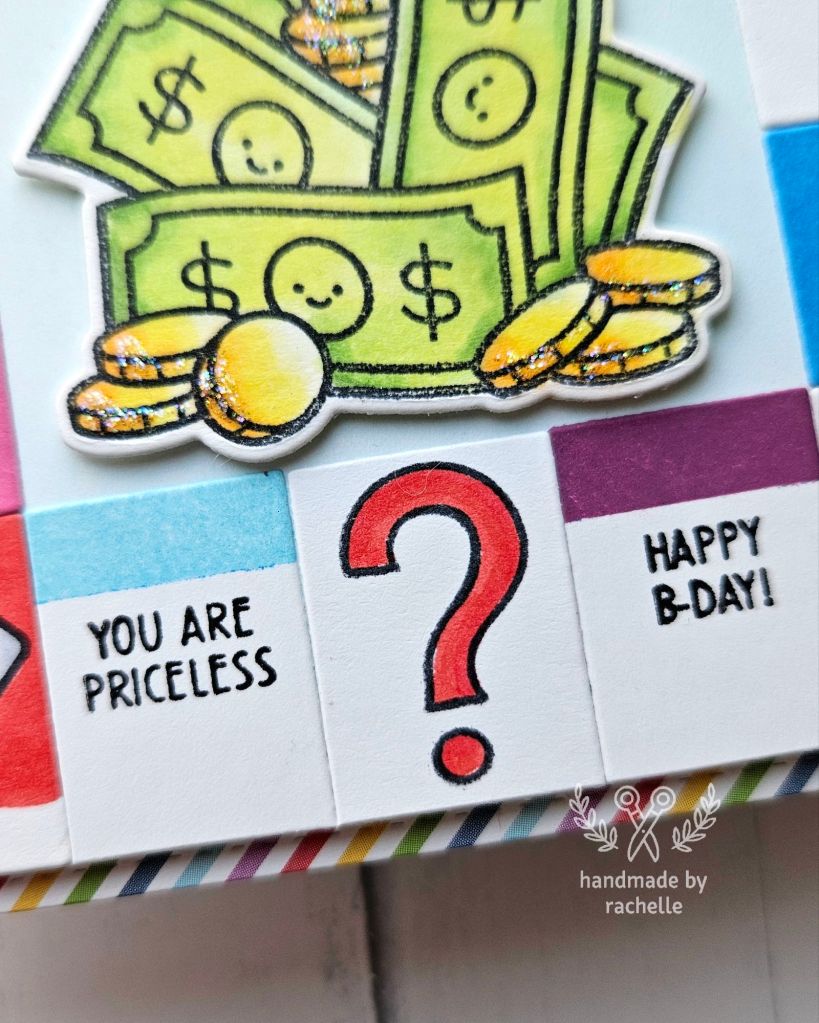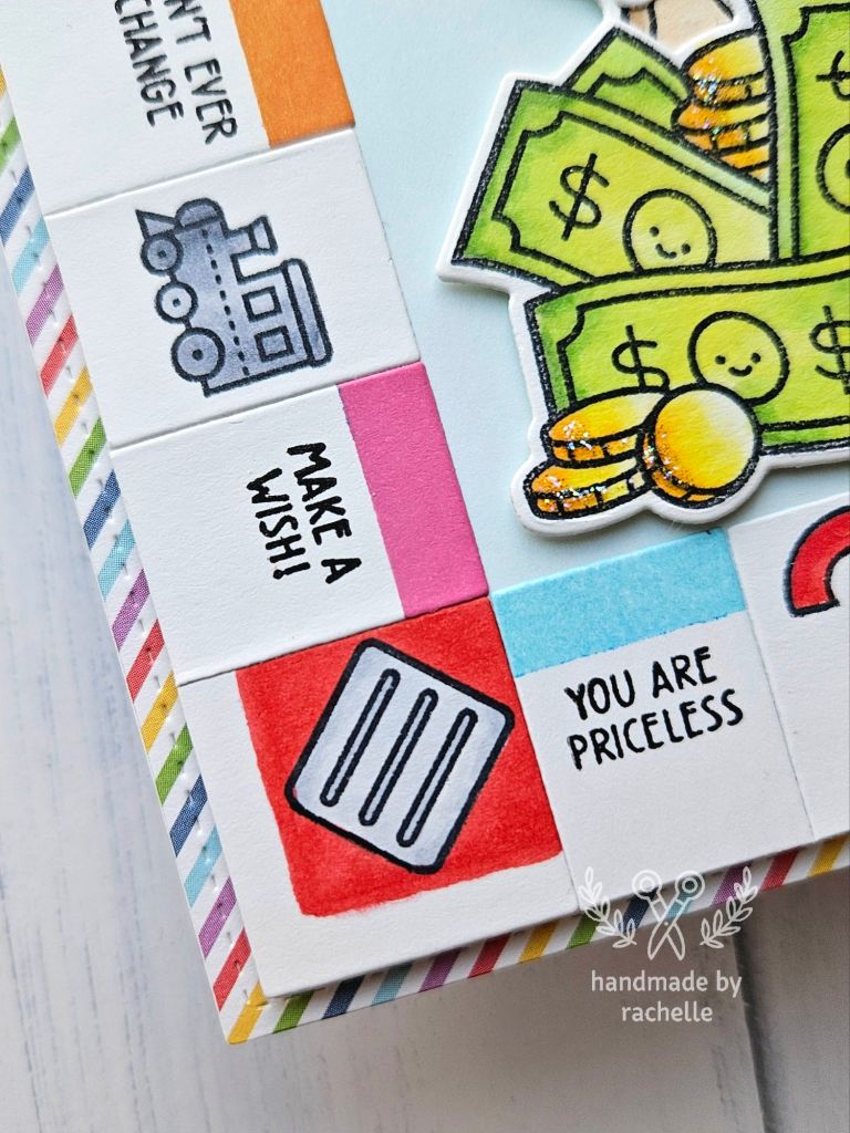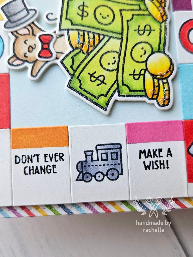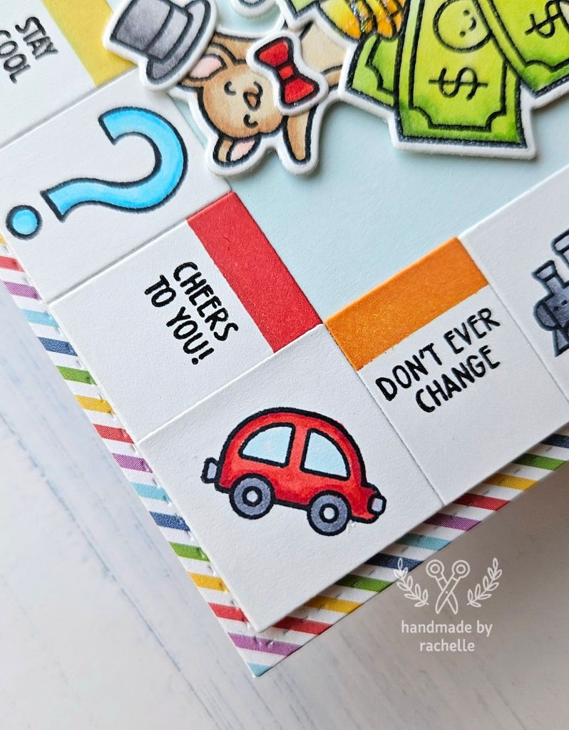 This was a design by Catherine Cohen that I really enjoyed recreating, with a few of my own twists. Her original card can be seen here: https://crafticat.art/2024/07/01/monopoly-with-lawn-fawn/