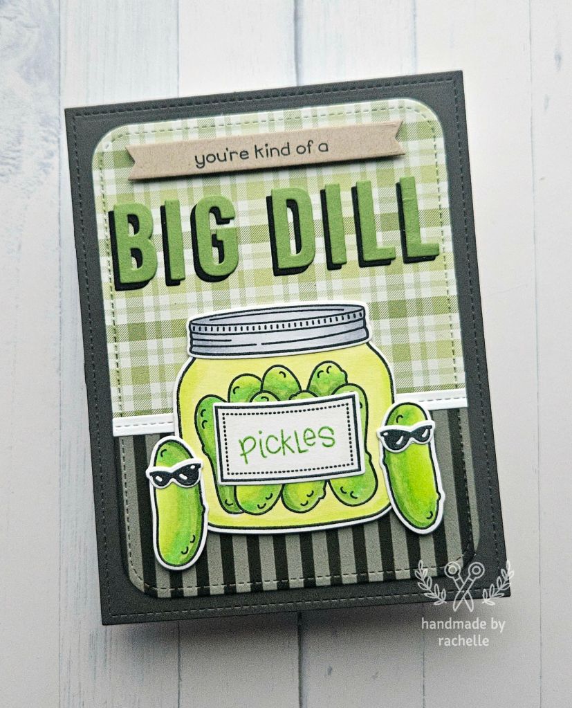 The first time I made this card I used coloring stencils on the pickles and I have to say, I prefer using markers. I don’t normally purchase coloring stencils but I decided to try it for this set because it seemed like an easy way to fill in the background of the jar. I do think that was easy, but coloring it with markers was equally easy. And I actually think using the stencils on the pickles was more time consuming because it meant having to stop and get the stencil lined up perfectly every time and watch for not getting ink outside the stencil, instead of just simply coloring them in. I used markers to color everything the second time (on the card above) and I liked it better.