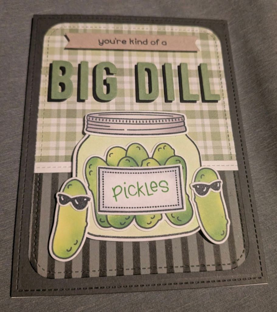 This was the original card I made using the coloring stencils. At least I was able to receive this picture after I sent it! 😊 I used Lawn Fawn Celery Stick ink for the background of the jar and distress oxide inks Twisted Citron and Mowed Lawn for the pickles.